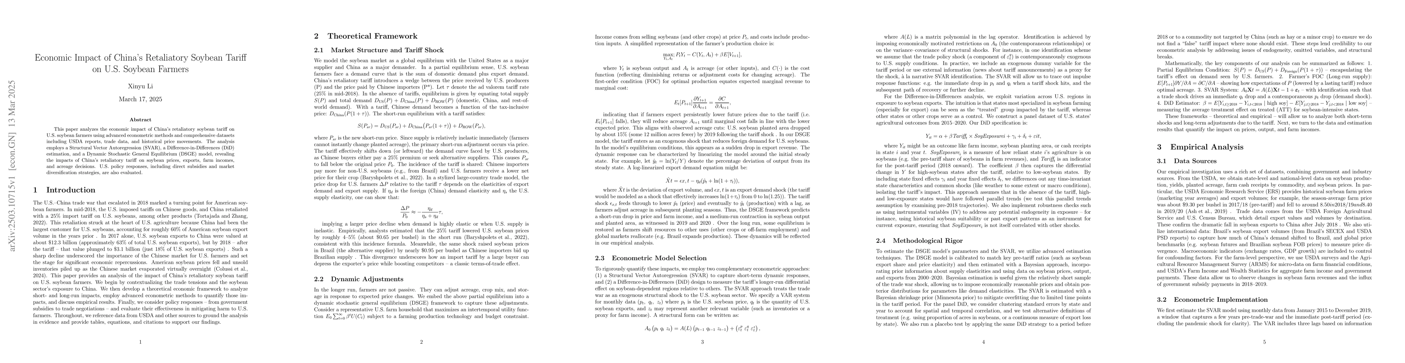 This paper uses advanced econometric methods to analyze the economic impact of China's retaliatory soybean tariff on U.S. farmers, revealing effects on prices, exports, incomes, and acreage decisions, while also evaluating U.S. policy responses. The study employs Structural Vector Autoregression, Difference-in-Differences, and Dynamic Stochastic General Equilibrium models.