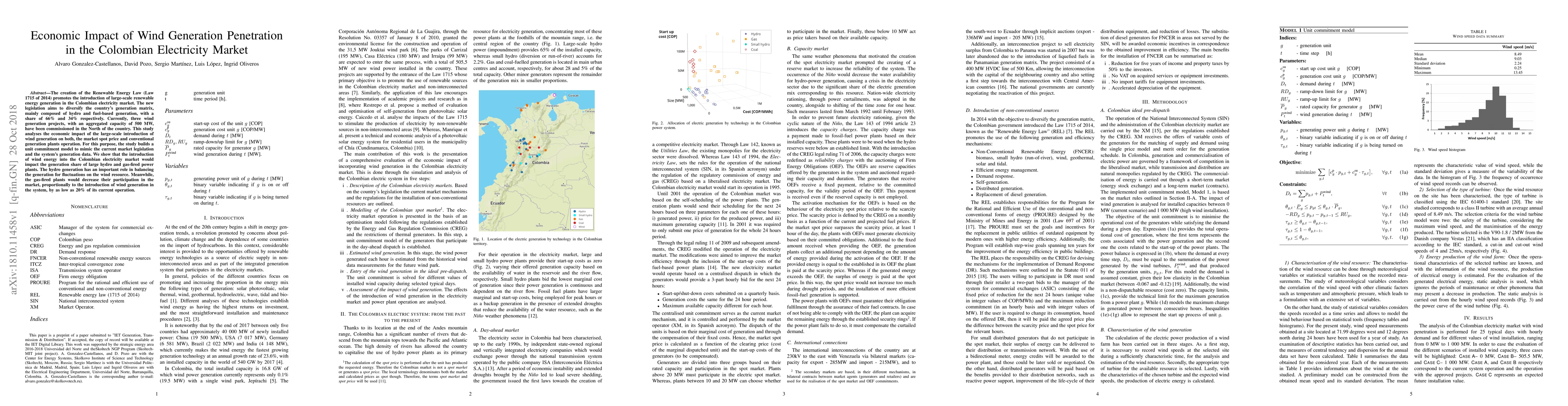 This study evaluates the economic impact of increasing wind generation in Colombia's electricity market, revealing that wind energy will reduce the market share of gas-fired plants by up to 20%, while hydro plants play a crucial role in balancing wind fluctuations. The analysis uses a unit commitment model based on current market legislation and generation data.