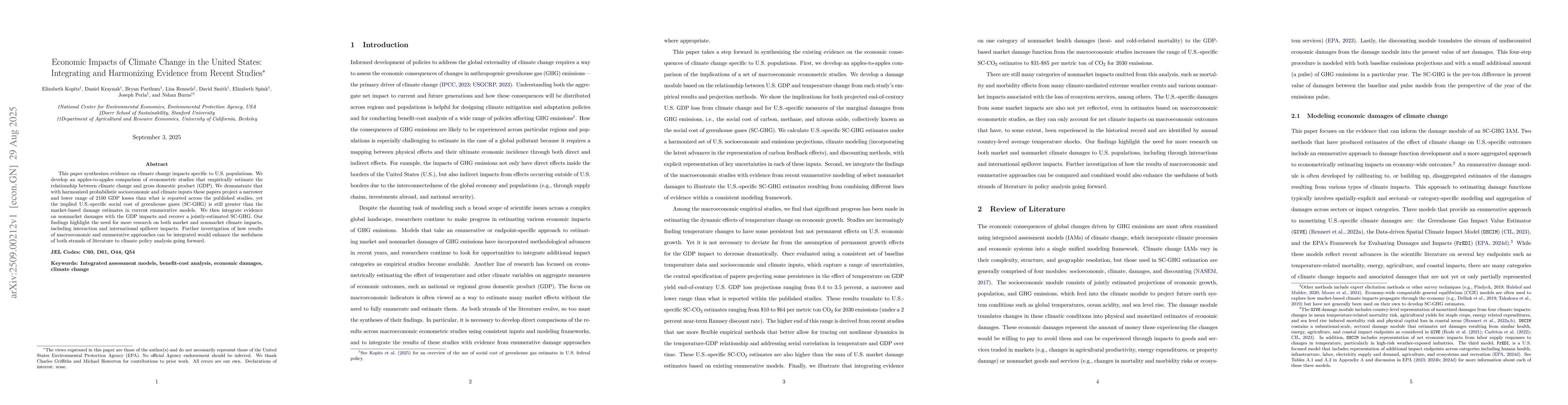 This paper synthesizes evidence on climate change impacts specific to U.S. populations. We develop an apples-to-apples comparison of econometric studies that empirically estimate the relationship between climate change and gross domestic product (GDP). We demonstrate that with harmonized probabilistic socioeconomic and climate inputs these papers project a narrower and lower range of 2100 GDP losses than what is reported across the published studies, yet the implied U.S.-specific social cost of greenhouse gases (SC-GHG) is still greater than the market-based damage estimates in current enumerative models. We then integrate evidence on nonmarket damages with the GDP impacts and recover a jointly-estimated SC-GHG. Our findings highlight the need for more research on both market and nonmarket climate impacts, including interaction and international spillover impacts. Further investigation of how results of macroeconomic and enumerative approaches can be integrated would enhance the usefulness of both strands of literature to climate policy analysis going forward.