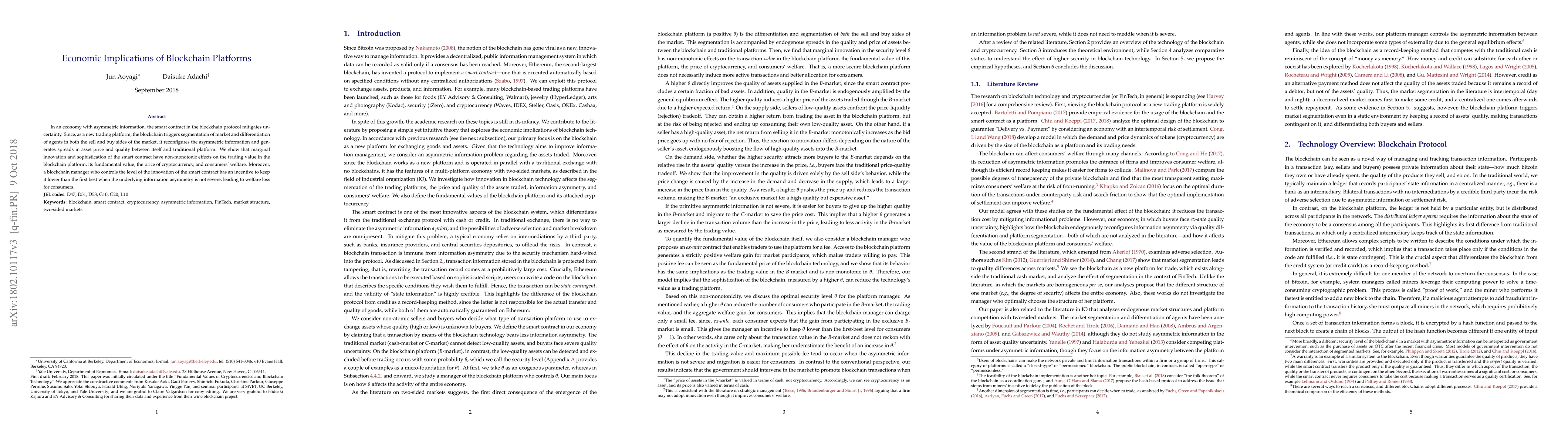 In an economy with asymmetric information, the smart contract in the blockchain protocol mitigates uncertainty. Since, as a new trading platform, the blockchain triggers segmentation of market and differentiation of agents in both the sell and buy sides of the market, it recomposes the asymmetric information and generates spreads in asset price and quality between itself and a traditional platform. We show that marginal innovation and sophistication of the smart contract have non-monotonic effects on the trading value in the blockchain platform, its fundamental value, the price of cryptocurrency, and consumers' welfare. Moreover, a blockchain manager who controls the level of the innovation of the smart contract has an incentive to keep it lower than the first best when the underlying information asymmetry is not severe, leading to welfare loss for consumers.