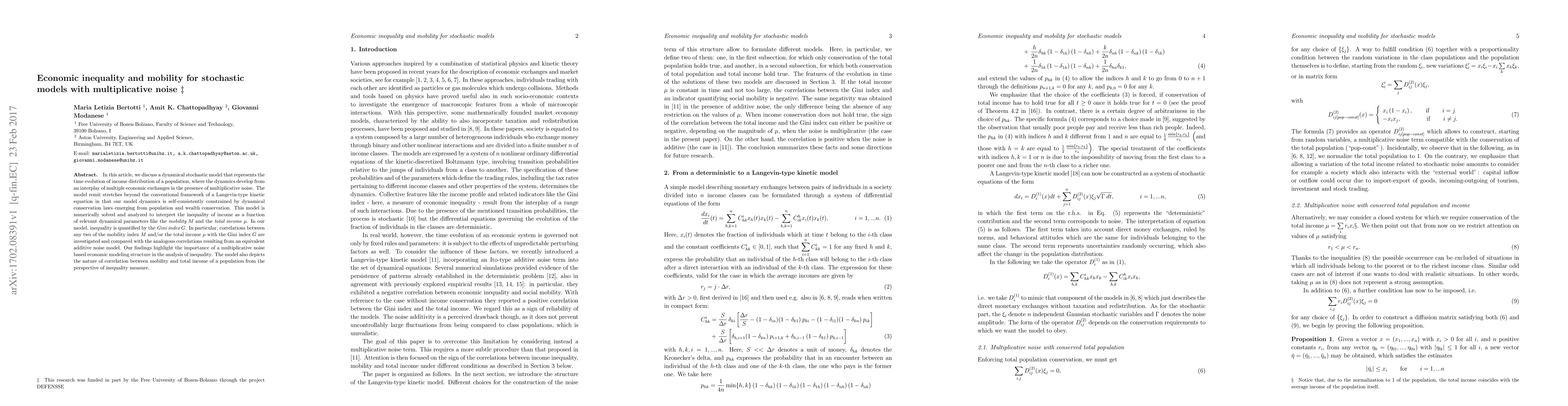 This paper develops a stochastic dynamical model to study income distribution dynamics, incorporating multiplicative noise and conservation laws. The model's inequality, quantified by the Gini index, correlates with mobility and total income, and reveals insights into the impact of multiplicative noise on economic inequality compared to additive noise models.