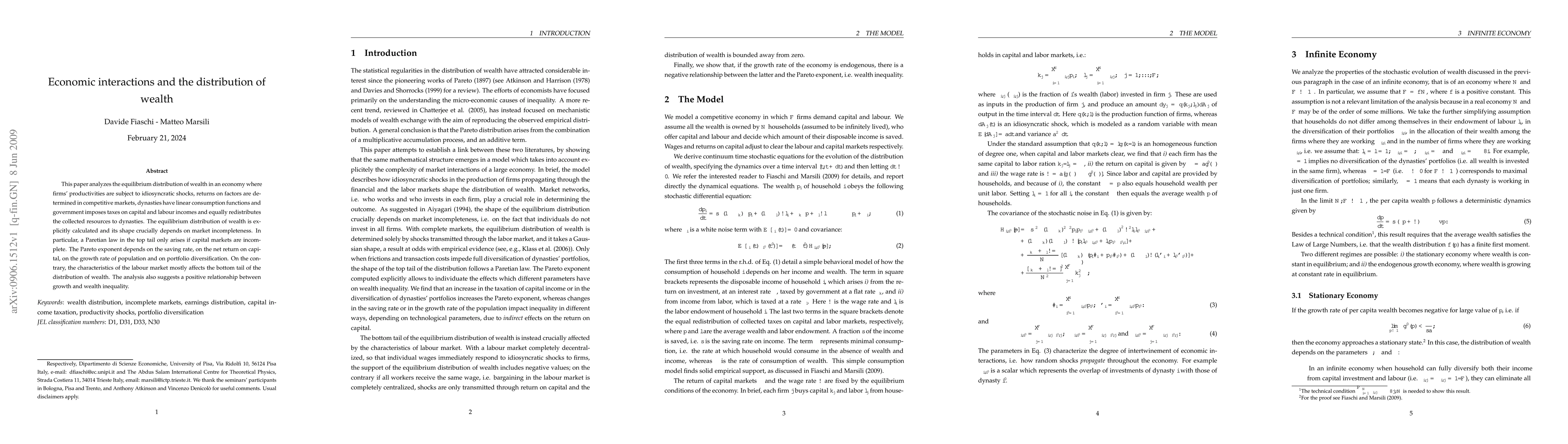 This paper analyzes the equilibrium distribution of wealth in an economy where firms' productivities are subject to idiosyncratic shocks, returns on factors are determined in competitive markets, dynasties have linear consumption functions and government imposes taxes on capital and labour incomes and equally redistributes the collected resources to dynasties. The equilibrium distribution of wealth is explicitly calculated and its shape crucially depends on market incompleteness. In particular, a Paretian law in the top tail only arises if capital markets are incomplete. The Pareto exponent depends on the saving rate, on the net return on capital, on the growth rate of population and on portfolio diversification. On the contrary, the characteristics of the labour market mostly affects the bottom tail of the distribution of wealth. The analysis also suggests a positive relationship between growth and wealth inequality.