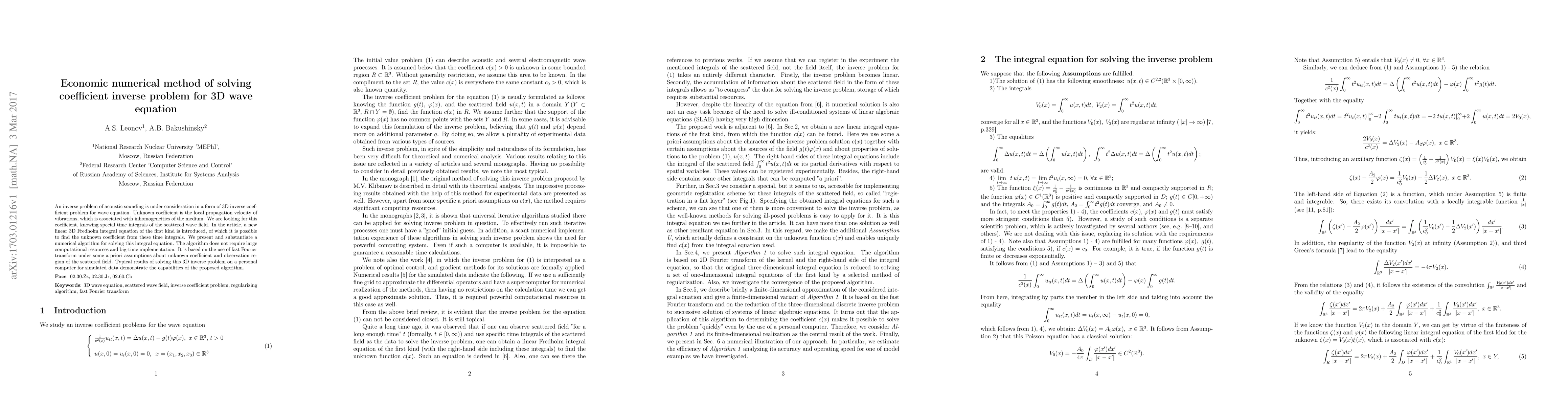 This paper proposes a new numerical method for solving the inverse coefficient problem in 3D acoustic wave equations, where the goal is to determine the local propagation velocity from time integrals of the scattered wave field. The method involves a linear 3D Fredholm integral equation and a computationally efficient algorithm based on the fast Fourier transform, validated through simulations on personal computers.