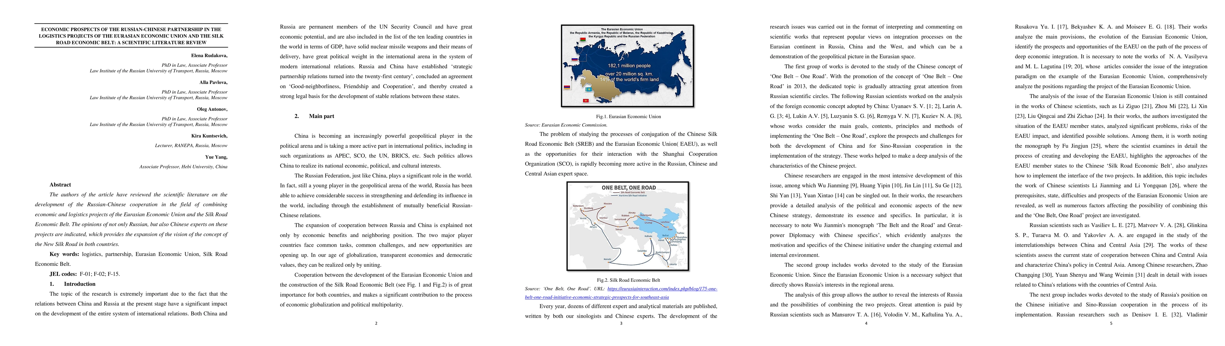 Summary: This paper reviews scientific literature on the economic and logistics collaboration between Russia and China within the Eurasian Economic Union and the Silk Road Economic Belt, incorporating insights from both Russian and Chinese experts to broaden the understanding of the New Silk Road initiative.