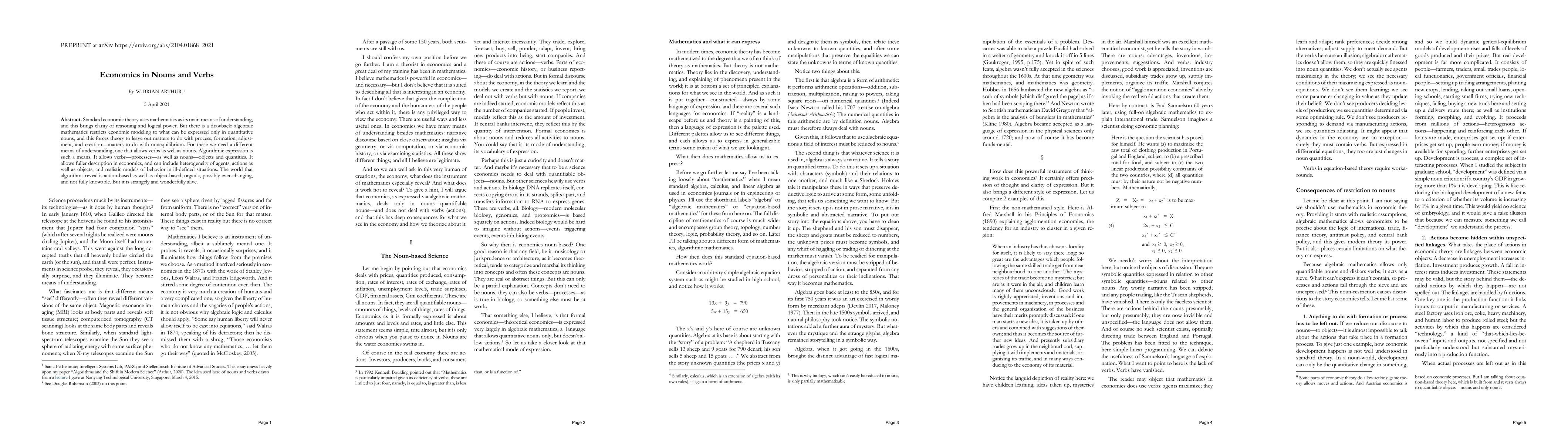 Standard economic theory uses mathematics as its main means of understanding, and this brings clarity of reasoning and logical power. But there is a drawback: algebraic mathematics restricts economic modeling to what can be expressed only in quantitative nouns, and this forces theory to leave out matters to do with process, formation, adjustment, creation and nonequilibrium. For these we need a different means of understanding, one that allows verbs as well as nouns. Algorithmic expression is such a means. It allows verbs (processes) as well as nouns (objects and quantities). It allows fuller description in economics, and can include heterogeneity of agents, actions as well as objects, and realistic models of behavior in ill-defined situations. The world that algorithms reveal is action-based as well as object-based, organic, possibly ever-changing, and not fully knowable. But it is strangely and wonderfully alive.