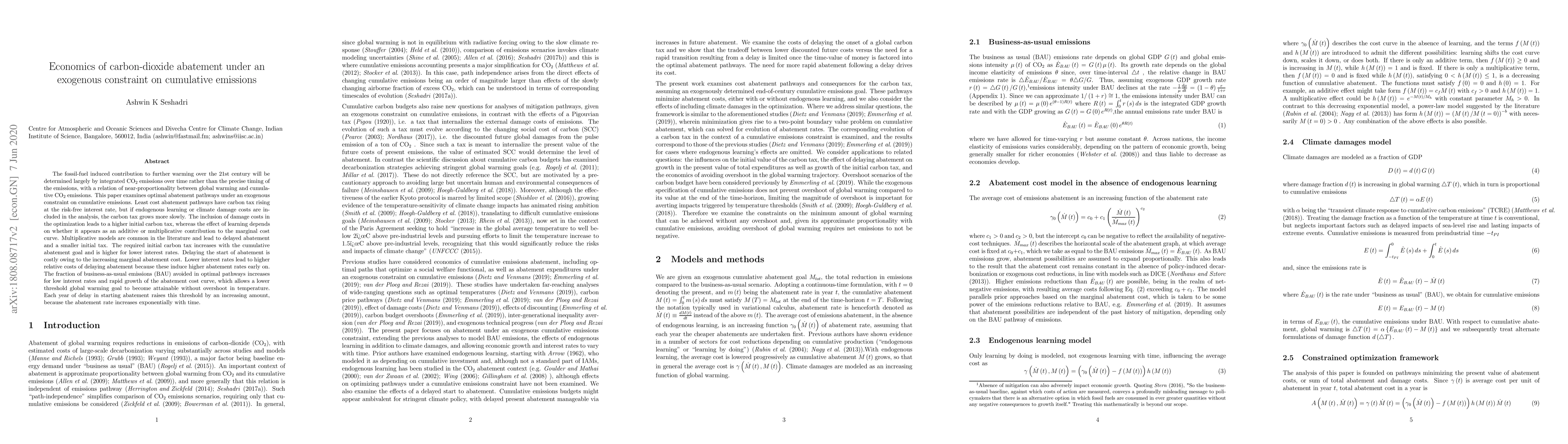 This paper explores optimal carbon-dioxide abatement strategies under a fixed cumulative emissions limit, finding that least-cost paths involve a rising carbon tax. The inclusion of climate damage costs and endogenous learning alters the tax trajectory, with multiplicative learning models delaying abatement and lowering initial tax rates.