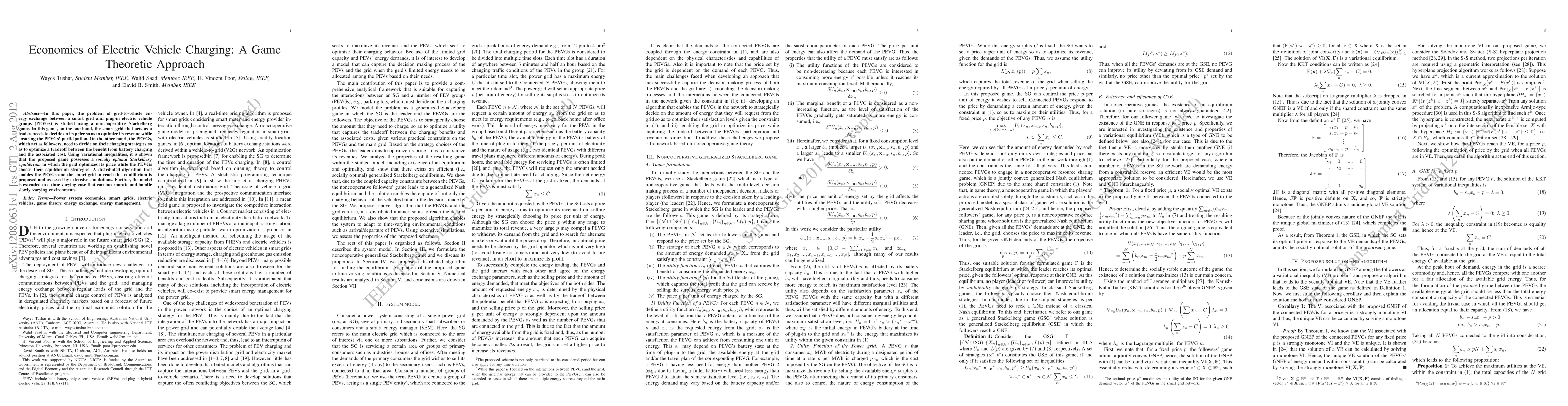 This paper employs a noncooperative Stackelberg game to study the grid-to-vehicle energy exchange between a smart grid and plug-in electric vehicle groups, proposing a socially optimal equilibrium and a distributed algorithm for achieving it. The model is extended to handle time-varying environments.