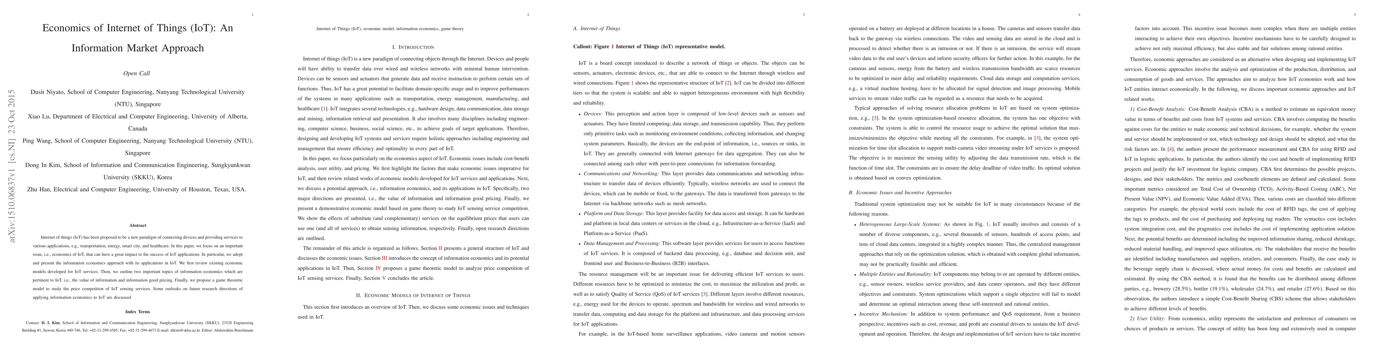 The paper presents an information market approach to IoT economics, integrating concepts from information economics to analyze value of information and information good pricing in IoT contexts.