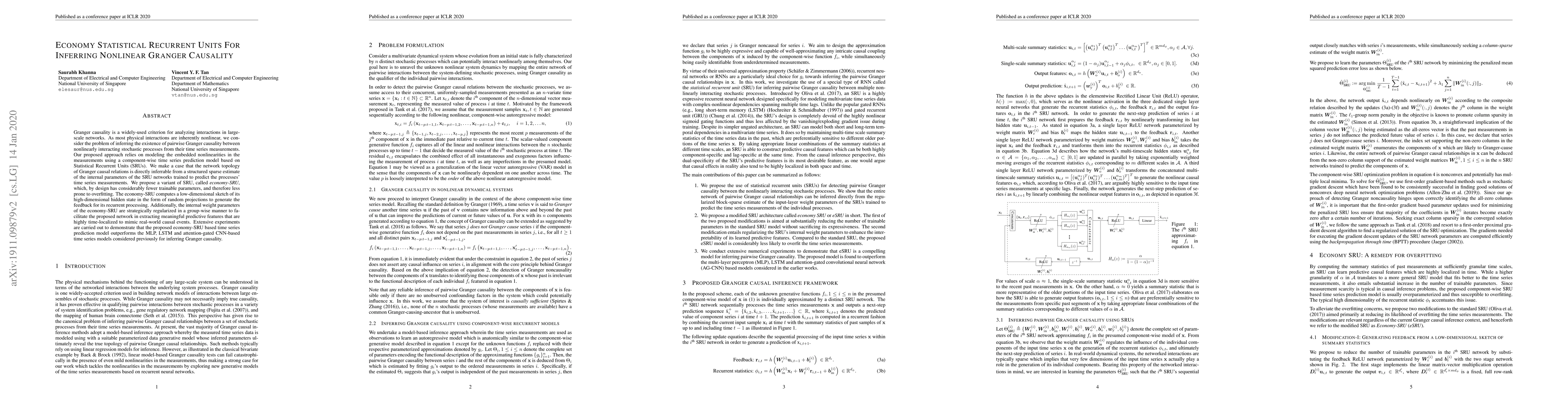 This paper proposes a Statistical Recurrent Unit (SRU) variant called economy-SRU for inferring nonlinear Granger causality in time series data. The economy-SRU, with fewer parameters and strategic regularization, effectively predicts nonlinear interactions and infers the network topology of Granger causal relations. Experiments show it outperforms other models like MLP, LSTM, and attention-gated CNNs.