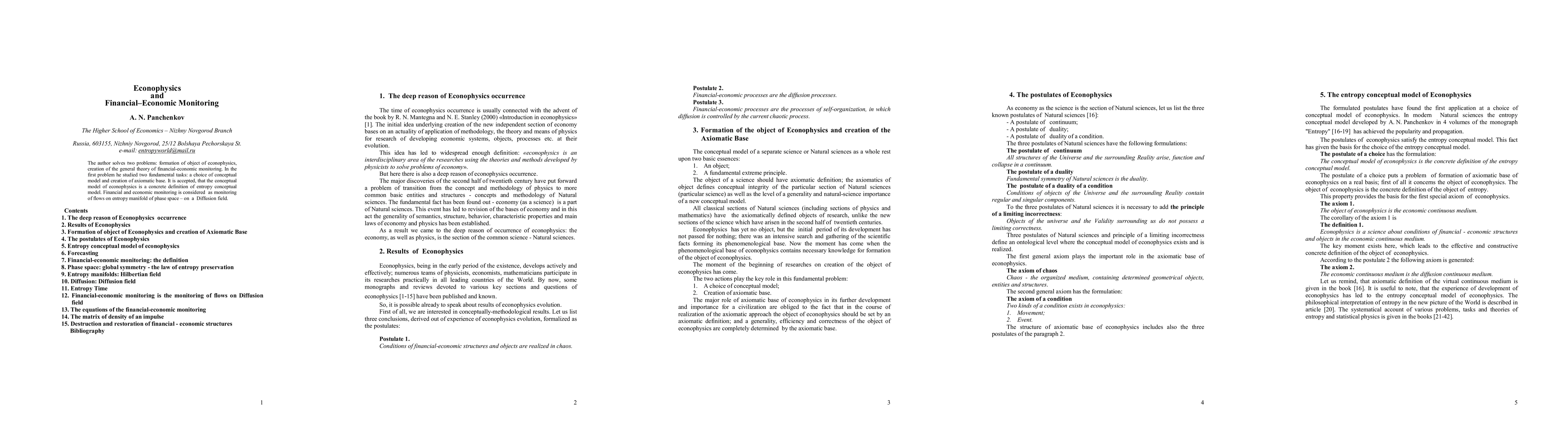 The author solves two problems: formation of object of econophysics, creation of the general theory of financial-economic monitoring. In the first problem he studied two fundamental tasks: a choice of conceptual model and creation of axiomatic base. It is accepted, that the conceptual model of econophysics is a concrete definition of entropy conceptual model. Financial and economic monitoring is considered as monitoring of flows on entropy manifold of phase space - on a Diffusion field.