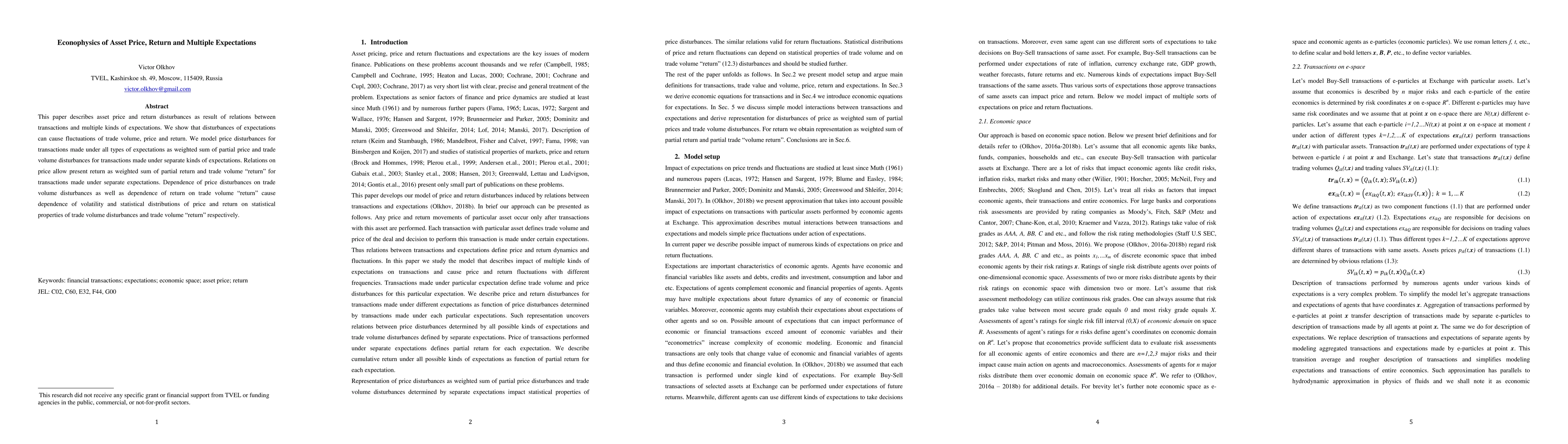 This paper describes asset price and return disturbances as result of relations between transactions and multiple kinds of expectations. We show that disturbances of expectations can cause fluctuations of trade volume, price and return. We model price disturbances for transactions made under all types of expectations as weighted sum of partial price and trade volume disturbances for transactions made under separate kinds of expectations. Relations on price allow present return as weighted sum of partial return and trade volume "return" for transactions made under separate expectations. Dependence of price disturbances on trade volume disturbances as well as dependence of return on trade volume "return" cause dependence of volatility and statistical distributions of price and return on statistical properties of trade volume disturbances and trade volume "return" respectively.