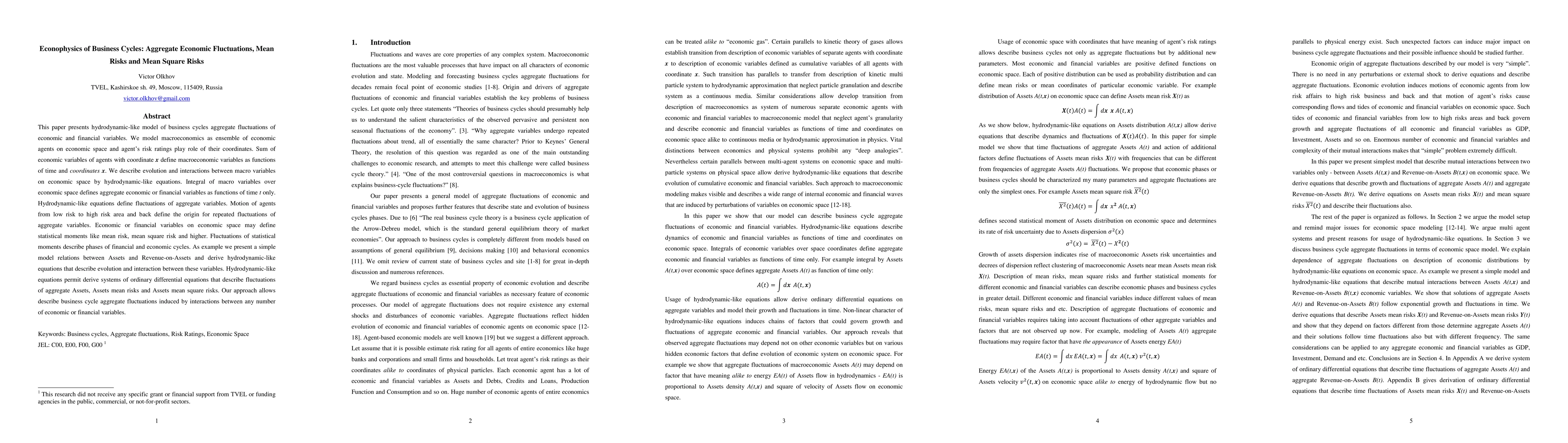 This paper presents hydrodynamic-like model of business cycles aggregate fluctuations of economic and financial variables. We model macroeconomics as ensemble of economic agents on economic space and agent's risk ratings play role of their coordinates. Sum of economic variables of agents with coordinate x define macroeconomic variables as functions of time and coordinates x. We describe evolution and interactions between macro variables on economic space by hydrodynamic-like equations. Integral of macro variables over economic space defines aggregate economic or financial variables as functions of time t only. Hydrodynamic-like equations define fluctuations of aggregate variables. Motion of agents from low risk to high risk area and back define the origin for repeated fluctuations of aggregate variables. Economic or financial variables on economic space may define statistical moments like mean risk, mean square risk and higher. Fluctuations of statistical moments describe phases of financial and economic cycles. As example we present a simple model relations between Assets and Revenue-on-Assets and derive hydrodynamic-like equations that describe evolution and interaction between these variables. Hydrodynamic-like equations permit derive systems of ordinary differential equations that describe fluctuations of aggregate Assets, Assets mean risks and Assets mean square risks. Our approach allows describe business cycle aggregate fluctuations induced by interactions between any number of economic or financial variables.