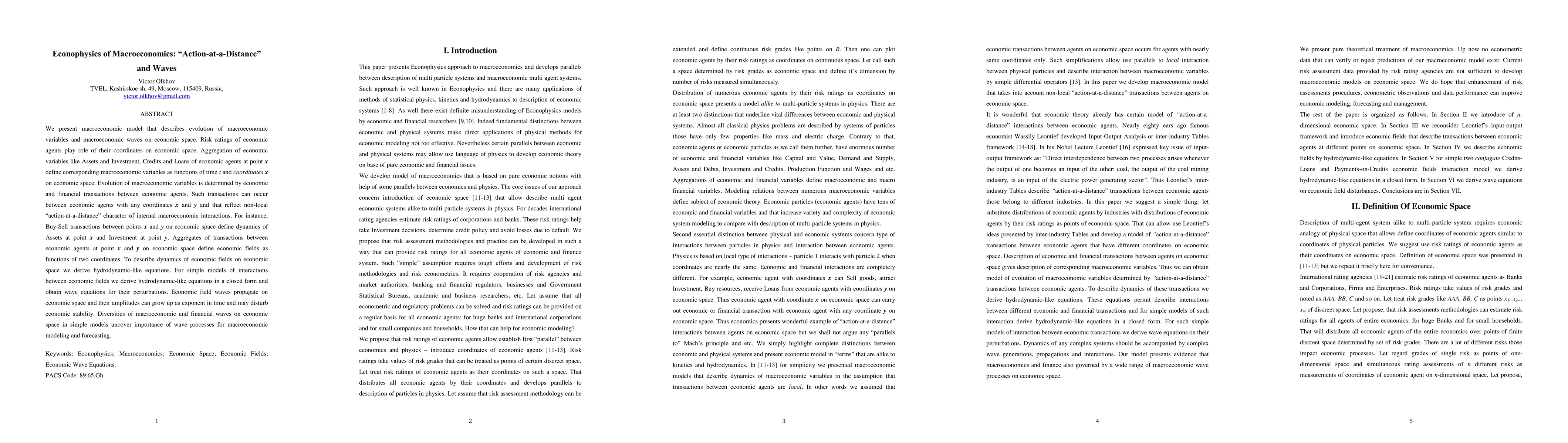 We present macroeconomic model that describes evolution of macroeconomic variables and macroeconomic waves on economic space. Risk ratings of economic agents play role of their coordinates on economic space. Aggregation of economic variables like Assets and Investment, Credits and Loans of economic agents at point x define corresponding macroeconomic variables as functions of time t and coordinates x on economic space. Evolution of macroeconomic variables is determined by economic and financial transactions between economic agents. Such transactions can occur between economic agents with any coordinates x and y and that reflect non-local "action-at-a-distance" character of internal macroeconomic interactions. For instance, Buy-Sell transactions between points x and y on economic space define dynamics of Assets at point x and Investment at point y. Aggregates of transactions between economic agents at point x and y on economic space define economic fields as functions of two coordinates. To describe dynamics of economic fields on economic space we derive hydrodynamic-like equations. For simple models of interactions between economic fields we derive hydrodynamic-like equations in a closed form and obtain wave equations for their perturbations. Economic field waves propagate on economic space and their amplitudes can grow up as exponent in time and may disturb economic stability. Diversities of macroeconomic and financial waves on economic space in simple models uncover importance of wave processes for macroeconomic modeling and forecasting.