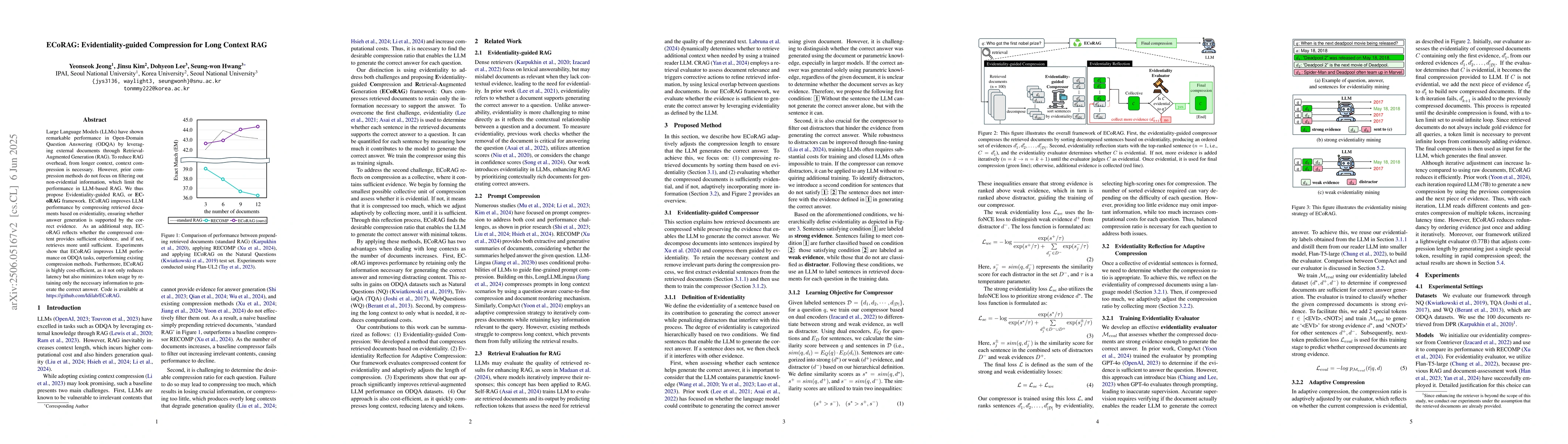 ECoRAG improves Large Language Model performance in Open-Domain Question Answering by compressing retrieved documents based on evidentiality, reducing latency and minimizing token usage.