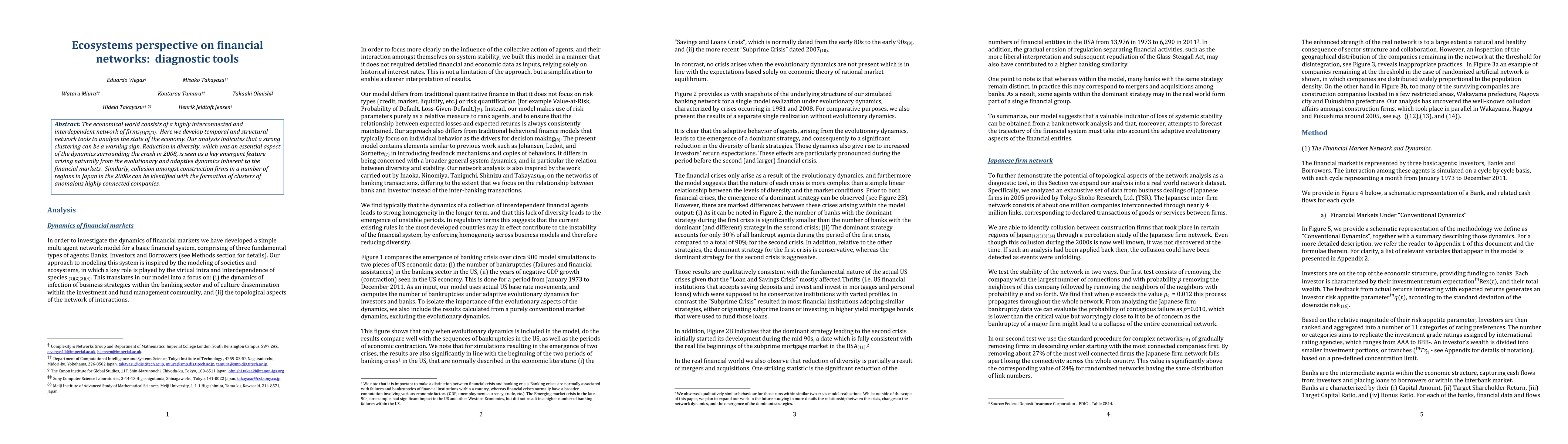 The economical world consists of a highly interconnected and interdependent network of firms. Here we develop temporal and structural network tools to analyze the state of the economy. Our analysis indicates that a strong clustering can be a warning sign. Reduction in diversity, which was an essential aspect of the dynamics surrounding the crash in 2008, is seen as a key emergent feature arising naturally from the evolutionary and adaptive dynamics inherent to the financial markets. Similarly, collusion amongst construction firms in a number of regions in Japan in the 2000s can be identified with the formation of clusters of anomalous highly connected companies.