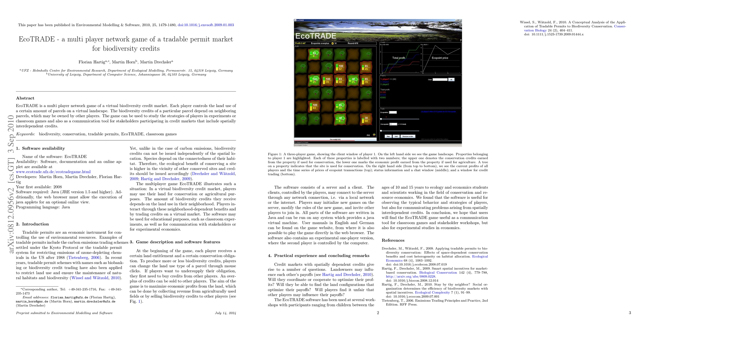 EcoTRADE is a multi player network game of a virtual biodiversity credit market. Each player controls the land use of a certain amount of parcels on a virtual landscape. The biodiversity credits of a particular parcel depend on neighboring parcels, which may be owned by other players. The game can be used to study the strategies of players in experiments or classroom games and also as a communication tool for stakeholders participating in credit markets that include spatially interdependent credits.