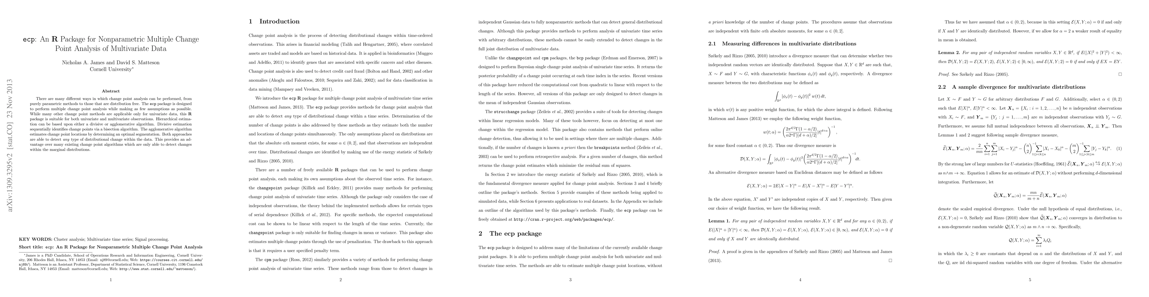 The ecp R package facilitates nonparametric multiple change point analysis for both univariate and multivariate data, employing either a hierarchical divisive or agglomerative algorithm to detect any type of distributional change without making strong assumptions. Unlike many existing methods, it is versatile and applicable to various data types.