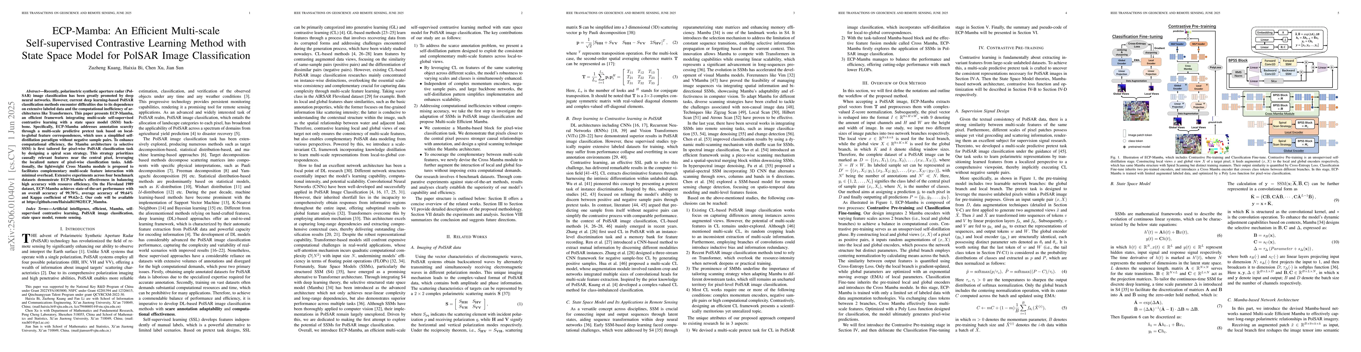 ECP-Mamba presents an efficient framework for PolSAR image classification using multi-scale self-supervised contrastive learning with a state space model backbone, achieving state-of-the-art performance while balancing accuracy and resource efficiency.