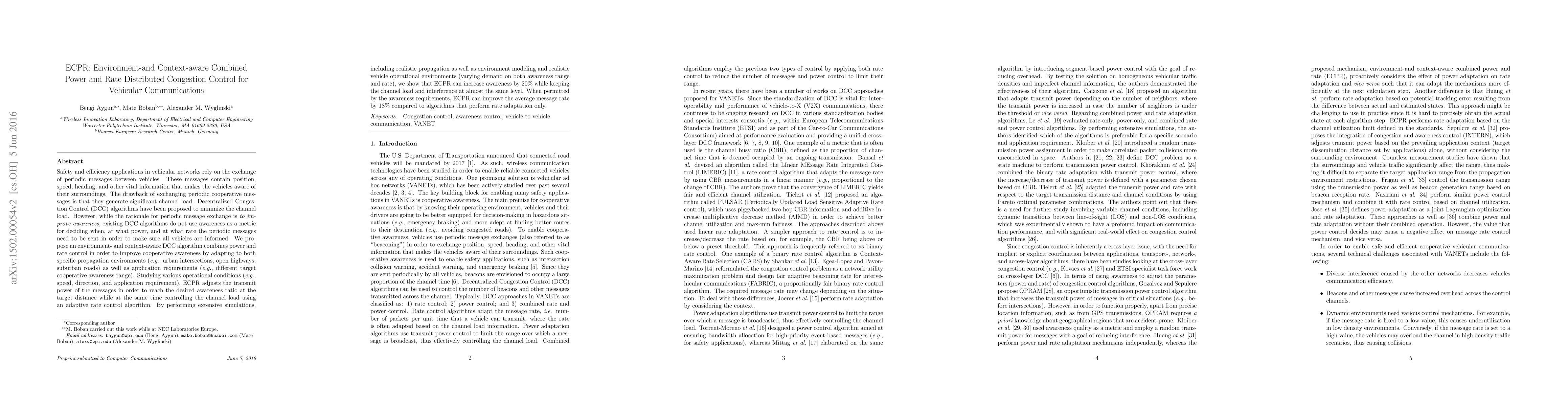 The ECPR algorithm proposes an environment- and context-aware distributed congestion control method for vehicular communications that combines power and rate control to enhance cooperative awareness while minimizing channel load. ECPR adapts transmit power and message rate based on specific propagation environments and application requirements, achieving a 20% increase in awareness with minimal interference.