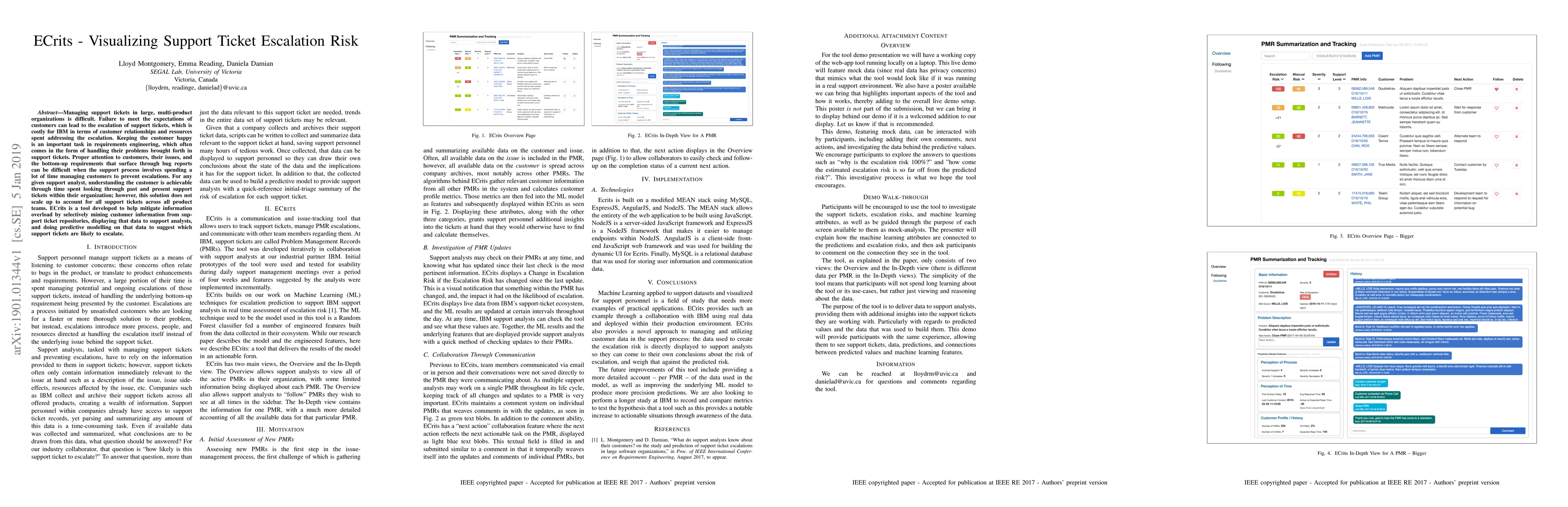 ECrits is a tool designed to help support analysts predict and mitigate support ticket escalations by mining and visualizing customer data from support ticket repositories, thus aiding in managing customer issues more effectively. The tool employs predictive modeling to identify tickets at risk of escalation, aiming to improve customer satisfaction and resource management.