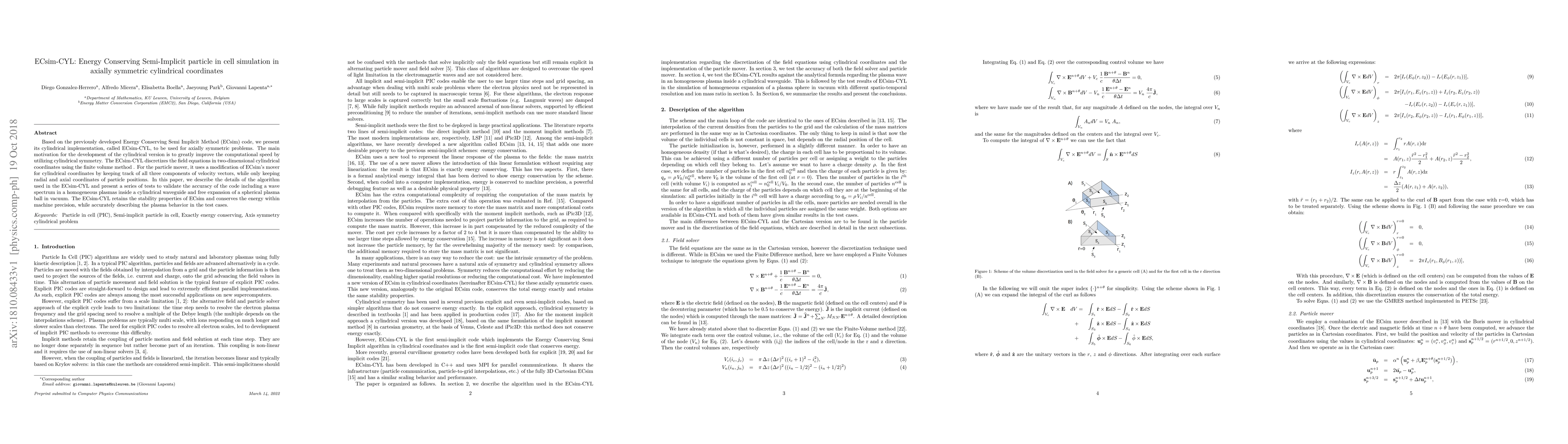ECsim-CYL is an energy conserving semi-implicit particle-in-cell simulation for axially symmetric problems in cylindrical coordinates, developed to enhance computational speed through symmetry. It maintains stability and energy conservation while accurately modeling plasma behavior in various tests.
