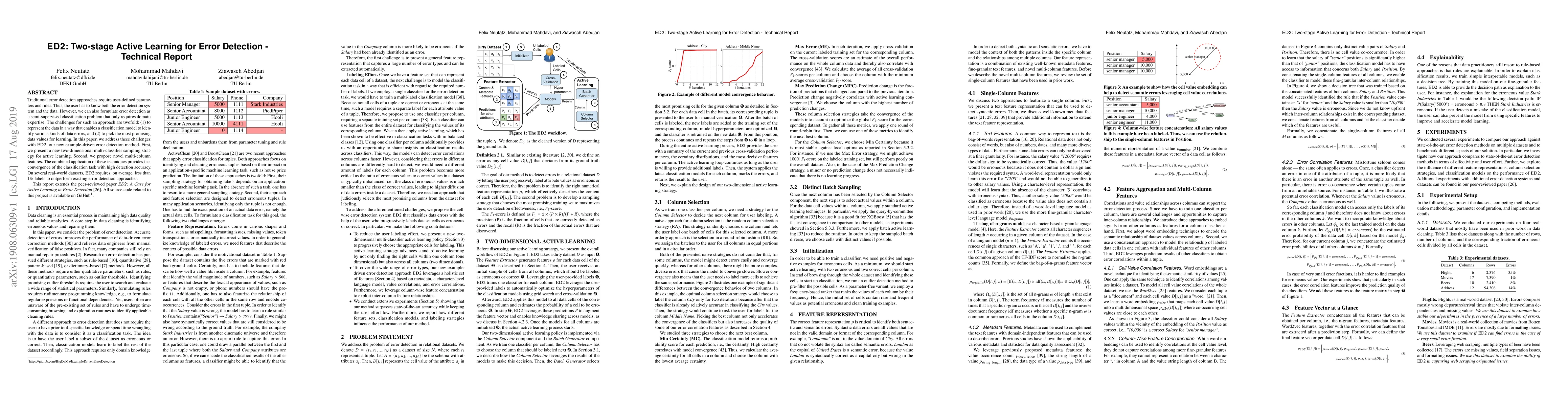 Traditional error detection approaches require user-defined parameters and rules. Thus, the user has to know both the error detection system and the data. However, we can also formulate error detection as a semi-supervised classification problem that only requires domain expertise. The challenges for such an approach are twofold: (1) to represent the data in a way that enables a classification model to identify various kinds of data errors, and (2) to pick the most promising data values for learning. In this paper, we address these challenges with ED2, our new example-driven error detection method. First, we present a new two-dimensional multi-classifier sampling strategy for active learning. Second, we propose novel multi-column features. The combined application of these techniques provides fast convergence of the classification task with high detection accuracy. On several real-world datasets, ED2 requires, on average, less than 1% labels to outperform existing error detection approaches. This report extends the peer-reviewed paper "ED2: A Case for Active Learning in Error Detection". All source code related to this project is available on GitHub.