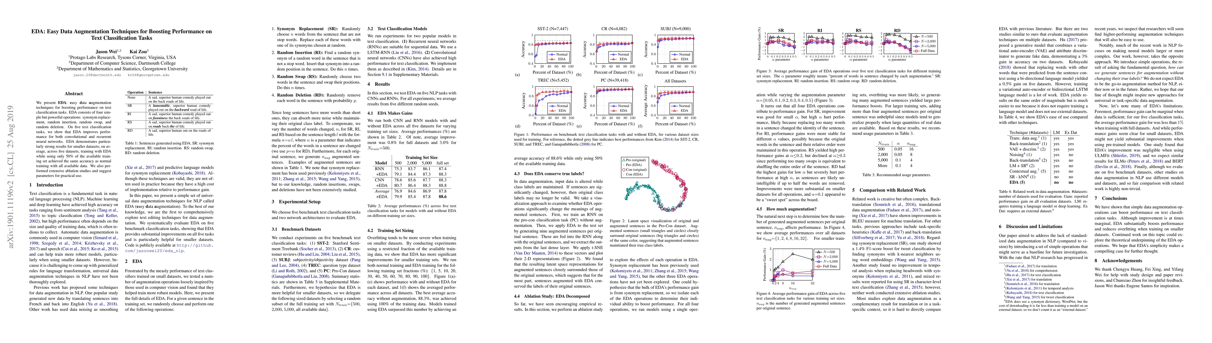 This paper introduces EDA, a simple data augmentation method using synonym replacement, random insertion, swap, and deletion to enhance text classification performance. EDA significantly boosts results for both convolutional and recurrent neural networks, especially on smaller datasets, often achieving full accuracy with only 50% of the training data.
