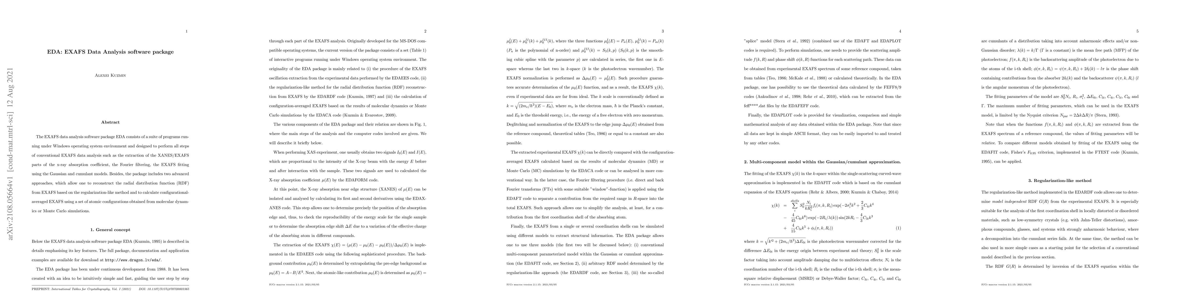 The EDA software package provides a comprehensive suite of programs for EXAFS data analysis, including methods to reconstruct the radial distribution function and calculate configurational-averaged EXAFS, offering advanced approaches for structural insights in materials science.