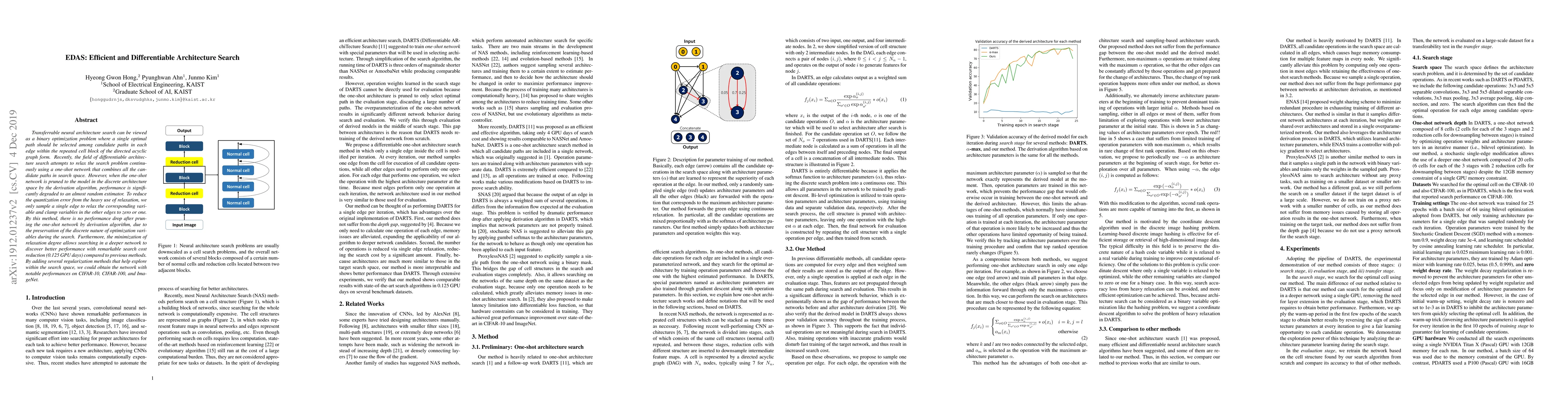 EDAS proposes an efficient differentiable architecture search method that minimizes quantization error by selectively relaxing variables, preserving the discrete nature of optimization, and achieving significant search cost reduction while maintaining performance. The approach also incorporates regularization techniques to explore the search space effectively, yielding strong results on CIFAR-10, CIFAR-100, and ImageNet.