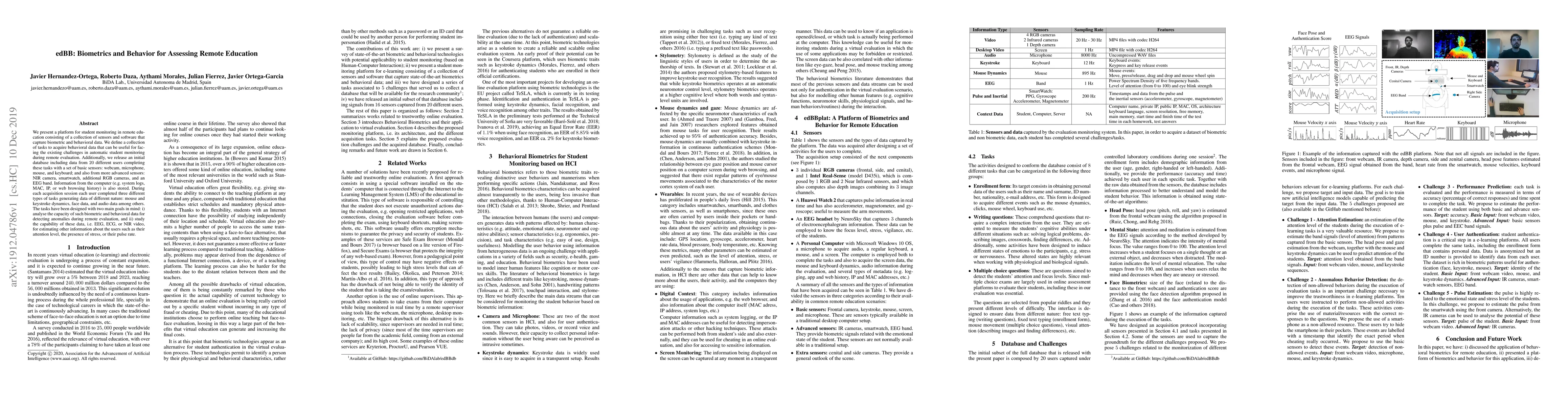 We present a platform for student monitoring in remote education consisting of a collection of sensors and software that capture biometric and behavioral data. We define a collection of tasks to acquire behavioral data that can be useful for facing the existing challenges in automatic student monitoring during remote evaluation. Additionally, we release an initial database including data from 20 different users completing these tasks with a set of basic sensors: webcam, microphone, mouse, and keyboard; and also from more advanced sensors: NIR camera, smartwatch, additional RGB cameras, and an EEG band. Information from the computer (e.g. system logs, MAC, IP, or web browsing history) is also stored. During each acquisition session each user completed three different types of tasks generating data of different nature: mouse and keystroke dynamics, face data, and audio data among others. The tasks have been designed with two main goals in mind: i) analyse the capacity of such biometric and behavioral data for detecting anomalies during remote evaluation, and ii) study the capability of these data, i.e. EEG, ECG, or NIR video, for estimating other information about the users such as their attention level, the presence of stress, or their pulse rate.