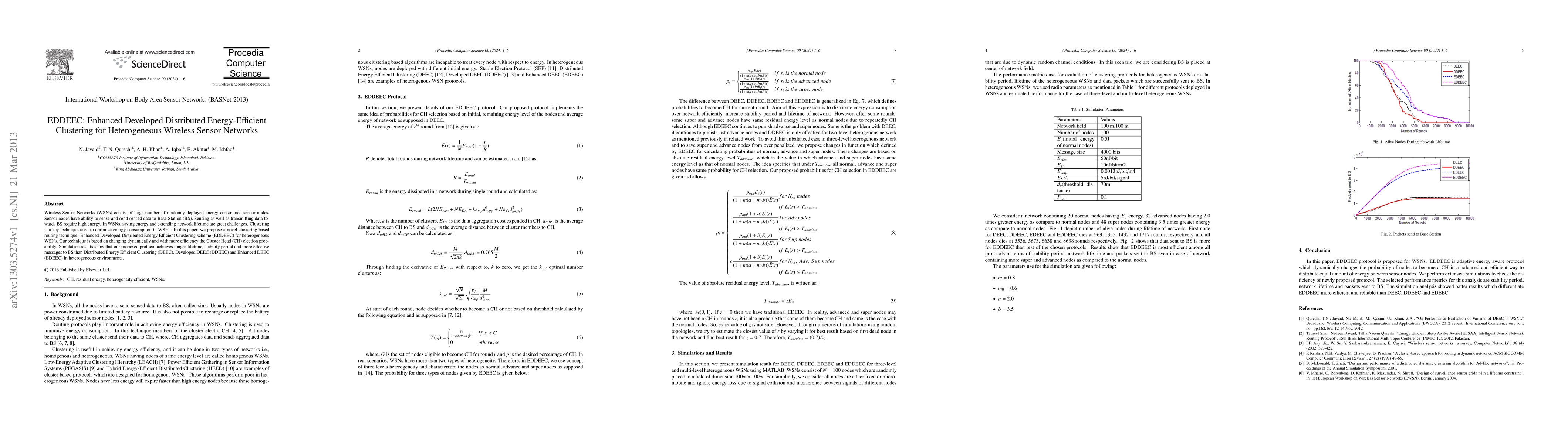 The research proposes a novel clustering based routing technique: Enhanced Developed Distributed Energy Efficient Clustering scheme (EDDEEC) for heterogeneous WSNs.