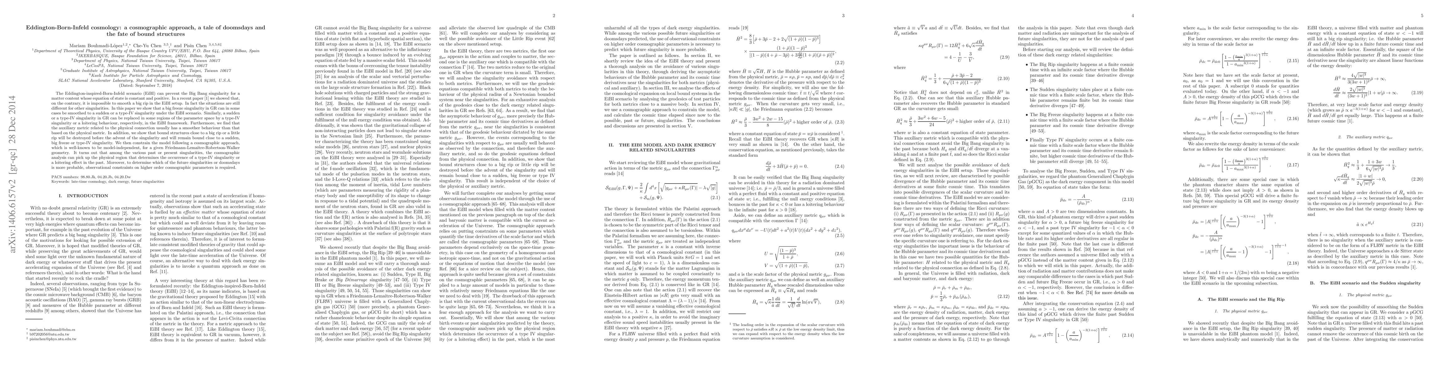 The Eddington-inspired-Born-Infeld scenario (EiBI) can prevent the Big Bang singularity for a matter content whose equation of state is constant and positive. In a recent paper we showed that, on the contrary, it is impossible to smooth a big rip in the EiBI setup. In fact the situations are still different for other singularities. In this paper we show that a big freeze singularity in general relativity (GR) can in some cases be smoothed to a sudden or a type IV singularity under the EiBI scenario. Similarly, a sudden or a type IV singularity in GR can be replaced in some regions of the parameter space by a type IV singularity or a loitering behaviour, respectively, in the EiBI framework. Furthermore, we find that the auxiliary metric related to the physical connection usually has a smoother behaviour than that based on the physical metric. In addition, we show that bound structures close to a big rip or a little rip will be destroyed before the advent of the singularity and will remain bound close to a sudden, big freeze or type IV singularity. We then constrain the model following a cosmographic approach, which is well-known to be model-independent, for a given Friedmann-Lema\^itre-Robertson-Walker geometry. It turns out that among the various past or present singularities, the cosmographic analysis can pick up the physical region that determines the occurrence of a type IV singularity or a loitering effect in the past. Moreover, to determine which of the future singularities or doomsdays is more probable, observational constraints on higher order cosmographic parameters is required.
