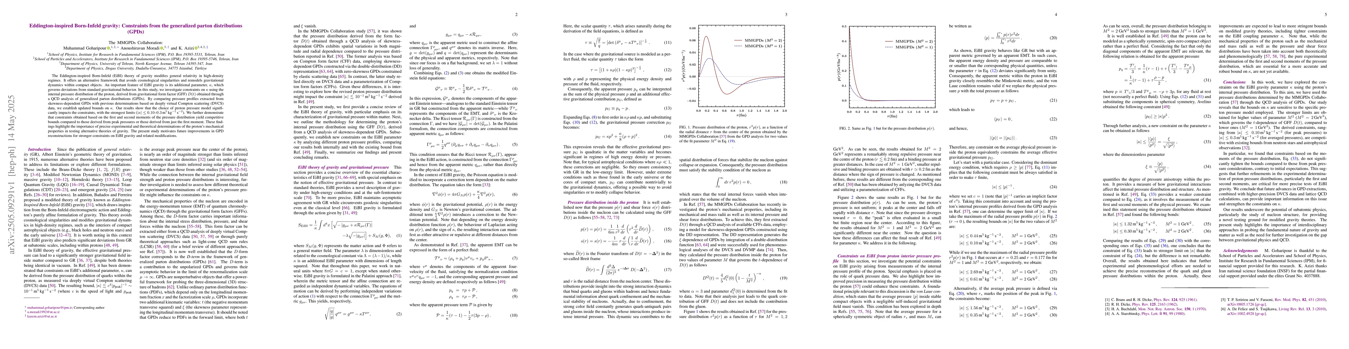 A study constrained the Eddington-inspired Born-Infeld gravity theory using proton pressure distributions derived from generalized parton distributions, yielding bounds on its additional parameter, α, of $|α| geq 0.10 ext{--}0.3$ m$^5$ kg$^{-1}$ s$^{-2}$.