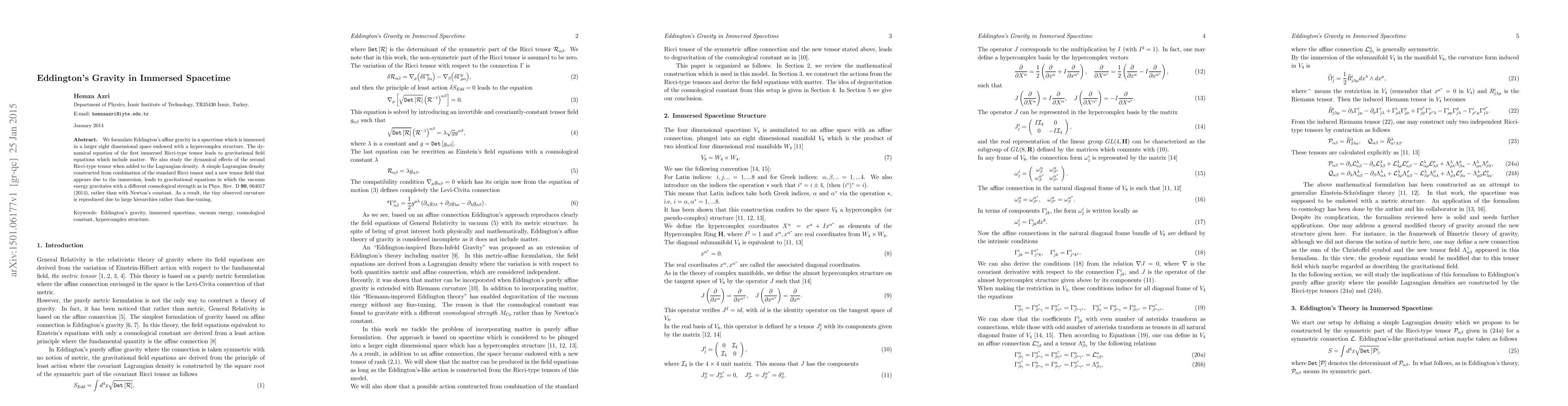 We formulate Eddington's affine gravity in a spacetime which is immersed in a larger eight dimensional space endowed with a hypercomplex structure. The dynamical equation of the first immersed Ricci-type tensor leads to gravitational field equations which include matter. We also study the dynamical effects of the second Ricci-type tensor when added to the Lagrangian density. A simple Lagrangian density constructed from combination of the standard Ricci tensor and a new tensor field that appears due to the immersion, leads to gravitational equations in which the vacuum energy gravitates with a different cosmological strength as in Phys. Rev. D {\bf 90}, 064017 (2014), rather than with Newton's constant. As a result, the tiny observed curvature is reproduced due to large hierarchies rather than fine-tuning.