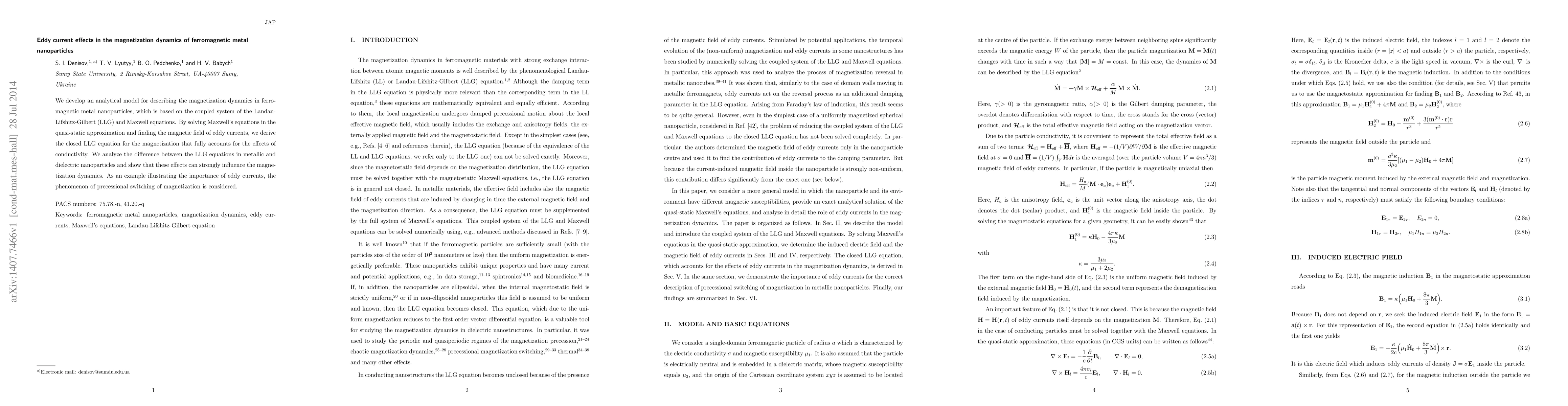 We develop an analytical model for describing the magnetization dynamics in ferromagnetic metal nanoparticles, which is based on the coupled system of the Landau-Lifshitz-Gilbert (LLG) and Maxwell equations. By solving Maxwell's equations in the quasi-static approximation and finding the magnetic field of eddy currents, we derive the closed LLG equation for the magnetization that fully accounts for the effects of conductivity. We analyze the difference between the LLG equations in metallic and dielectric nanoparticles and show that these effects can strongly influence the magnetization dynamics. As an example illustrating the importance of eddy currents, the phenomenon of precessional switching of magnetization is considered.