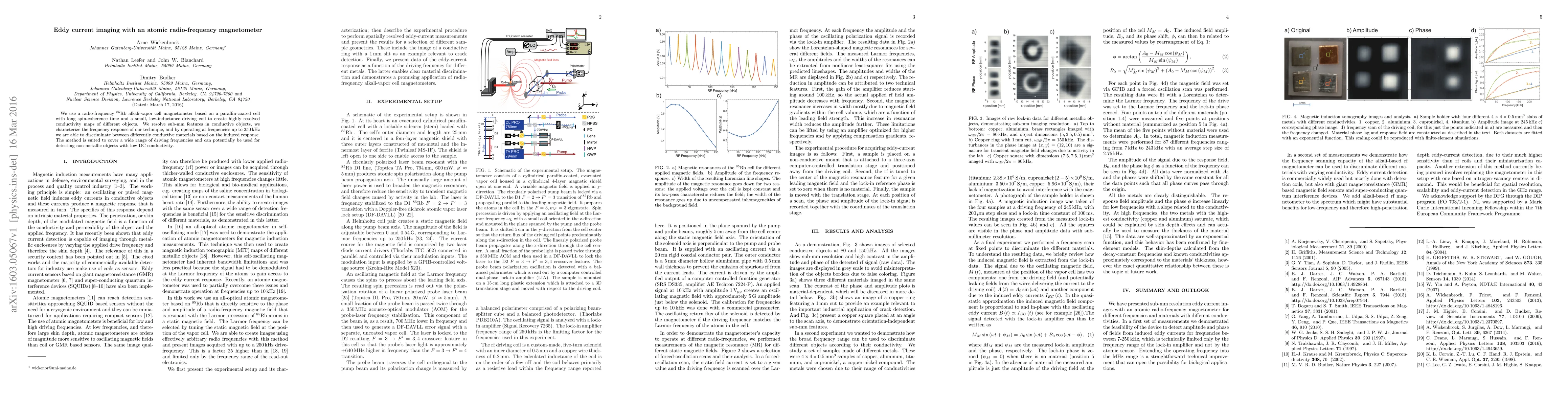 This paper presents a radio-frequency magnetometer using $^{85}$Rb alkali-vapor cells to create highly resolved conductivity maps of conductive objects, resolving sub-mm features and discriminating between materials based on induced responses at frequencies up to 250 kHz. The method is versatile and potentially useful for detecting non-metallic objects with low DC conductivity.