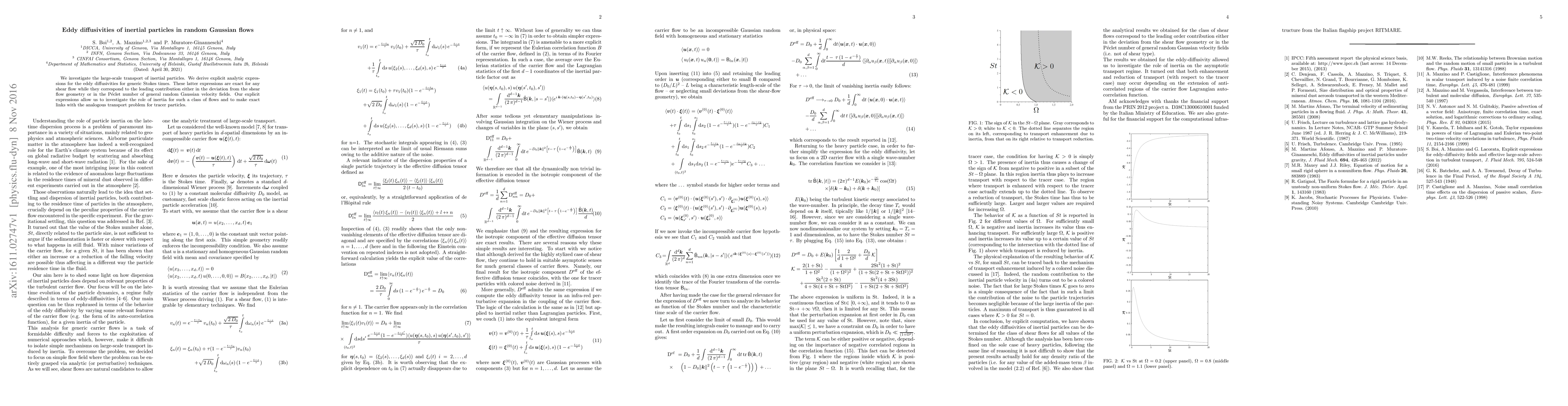 This paper derives explicit analytic expressions for eddy diffusivities of inertial particles in random Gaussian flows, providing exact results for any shear flow and linking inertial transport to tracer particle dynamics. The study highlights the role of particle inertia in large-scale transport processes.