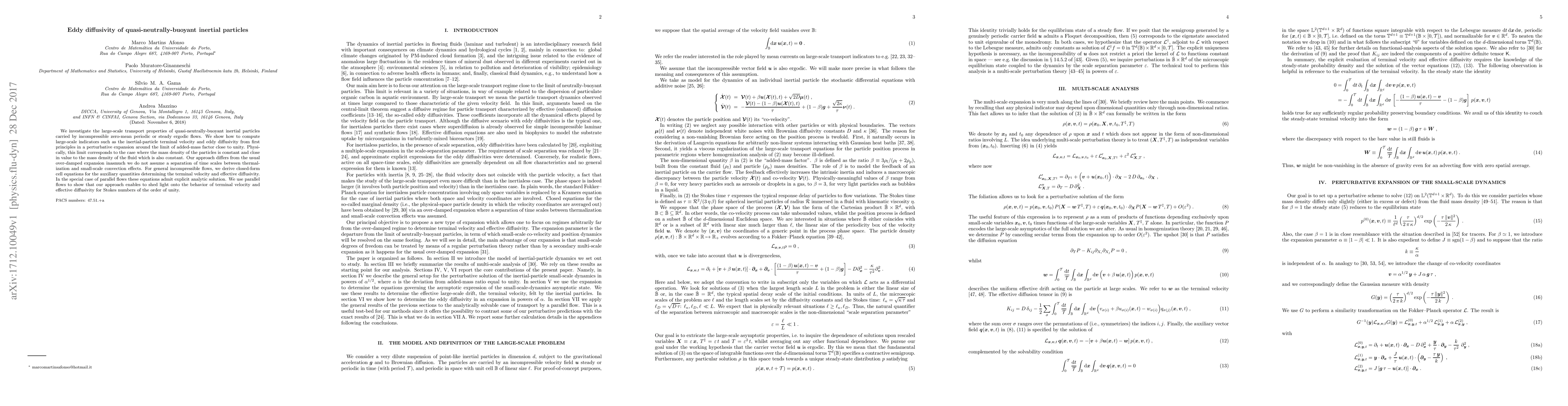 We investigate the large-scale transport properties of quasi-neutrally-buoyant inertial particles carried by incompressible zero-mean periodic or steady ergodic flows. We show how to compute large-scale indicators such as the inertial-particle terminal velocity and eddy diffusivity from first principles in a perturbative expansion around the limit of added-mass factor close to unity. Physically, this limit corresponds to the case where the mass density of the particles is constant and close in value to the mass density of the fluid which is also constant. Our approach differs from the usual over-damped expansion inasmuch we do not assume a separation of time scales between thermalization and small-scale convection effects. For general incompressible flows, we derive closed-form cell equations for the auxiliary quantities determining the terminal velocity and effective diffusivity. In the special case of parallel flows these equations admit explicit analytic solution. We use parallel flows to show that our approach enables to shed light onto the behavior of terminal velocity and effective diffusivity for Stokes numbers of the order of unity.