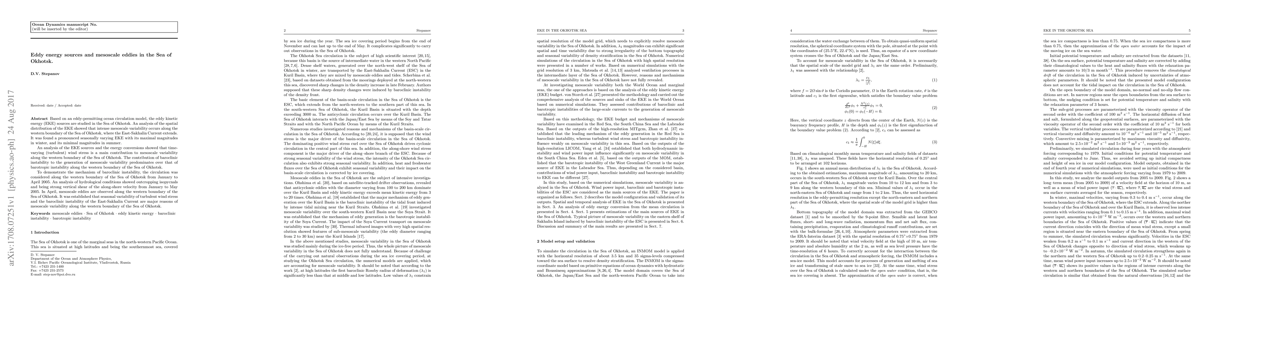 This study investigates eddy kinetic energy (EKE) sources in the Sea of Okhotsk using an ocean circulation model, revealing intense mesoscale variability along the western boundary driven by seasonal wind stress and baroclinic instability. The analysis highlights that baroclinic instability is the primary generator of mesoscale variability, with significant eddies forming in spring due to vertical shear and isopycnal outcropping.