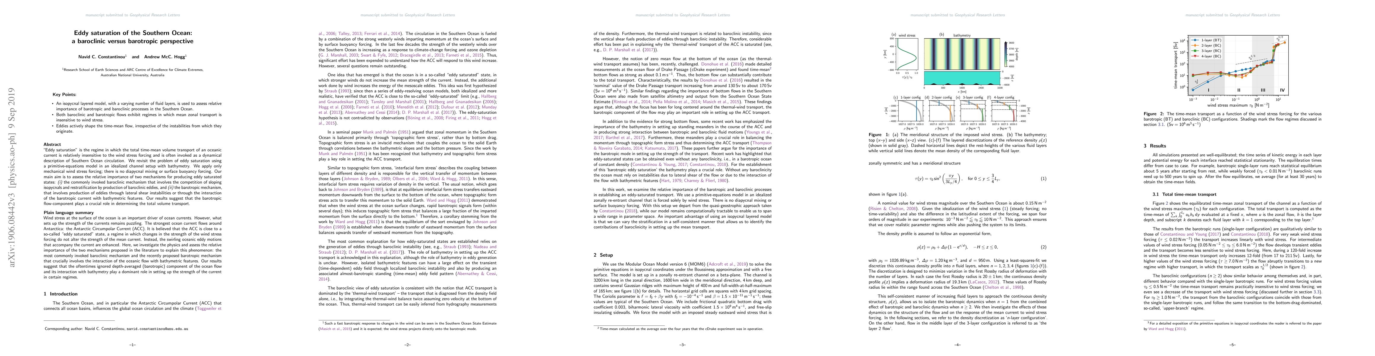 This paper investigates the mechanisms behind "eddy saturation" in the Southern Ocean using a primitive-equations model. It finds that while both baroclinic and barotropic processes contribute to eddy saturation, the barotropic mechanism significantly influences the total volume transport.