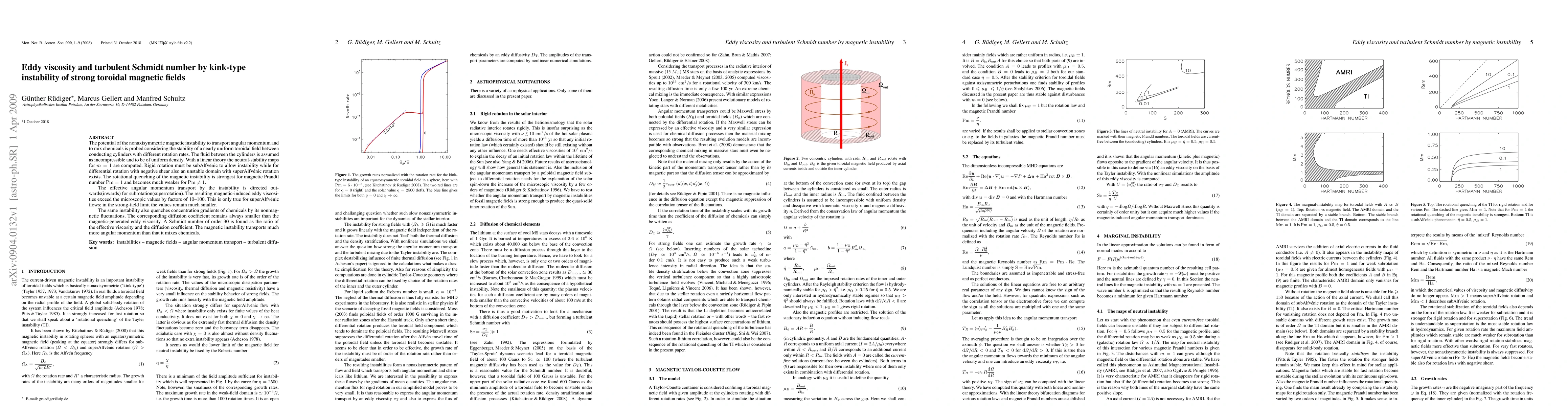 The potential of the nonaxisymmetric magnetic instability to transport angular momentum and to mix chemicals is probed considering the stability of a nearly uniform toroidal field between conducting cylinders with different rotation rates. The fluid between the cylinders is assumed as incompressible and to be of uniform density. With a linear theory the neutral-stability maps for m=1 are computed. Rigid rotation must be subAlfvenic to allow instability while for differential rotation with negative shear also an unstable domain with superAlfvenic rotation exists. The rotational quenching of the magnetic instability is strongest for magnetic Prandtl number Pm=1 and becomes much weaker for Pm unequal 1. The effective angular momentum transport by the instability is directed outwards(inwards) for subrotation(superrotation). The resulting magnetic-induced eddy viscosities exceed the microscopic values by factors of 10-100. This is only true for superAlfvenic flows; in the strong-field limit the values remain much smaller. The same instability also quenches concentration gradients of chemicals by its nonmagnetic fluctuations. The corresponding diffusion coefficient remains always smaller than the magnetic-generated eddy viscosity. A Schmidt number of order 30 is found as the ratio of the effective viscosity and the diffusion coefficient. The magnetic instability transports much more angular momentum than that it mixes chemicals.