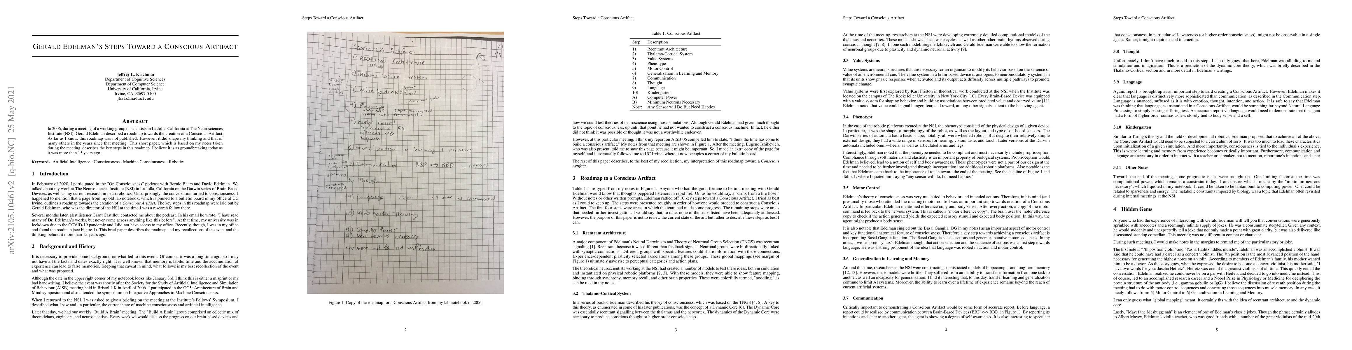 In 2006, during a meeting of a working group of scientists in La Jolla, California at The Neurosciences Institute (NSI), Gerald Edelman described a roadmap towards the creation of a Conscious Artifact. As far as I know, this roadmap was not published. However, it did shape my thinking and that of many others in the years since that meeting. This short paper, which is based on my notes taken during the meeting, describes the key steps in this roadmap. I believe it is as groundbreaking today as it was more than 15 years ago.
