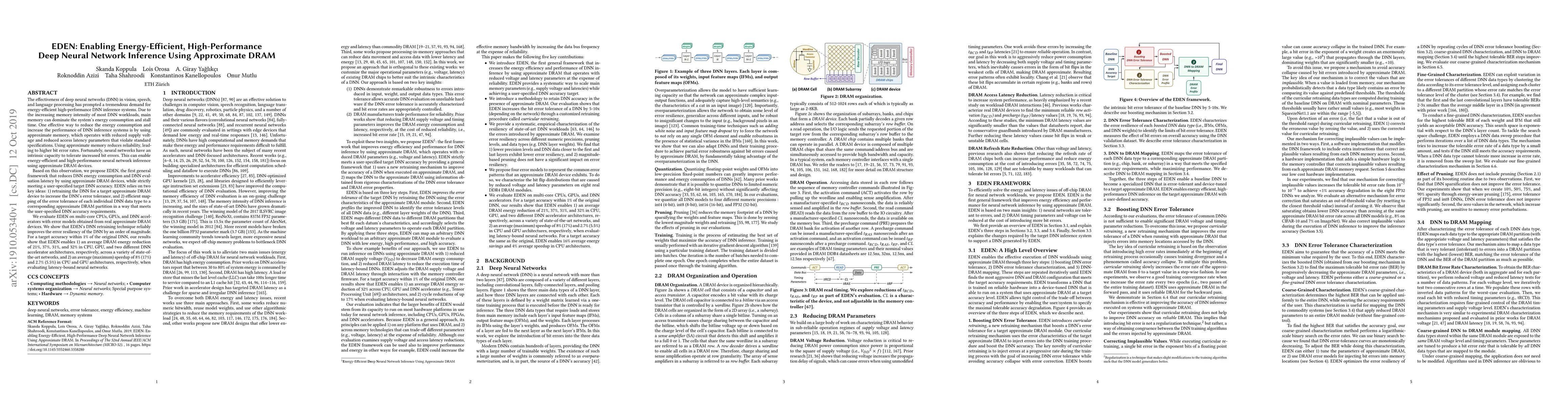 EDEN proposes a framework to enhance energy efficiency and performance of deep neural network inference using approximate DRAM, achieving up to 21% energy reduction and up to 17% speedup while maintaining DNN accuracy within 1% of the original.