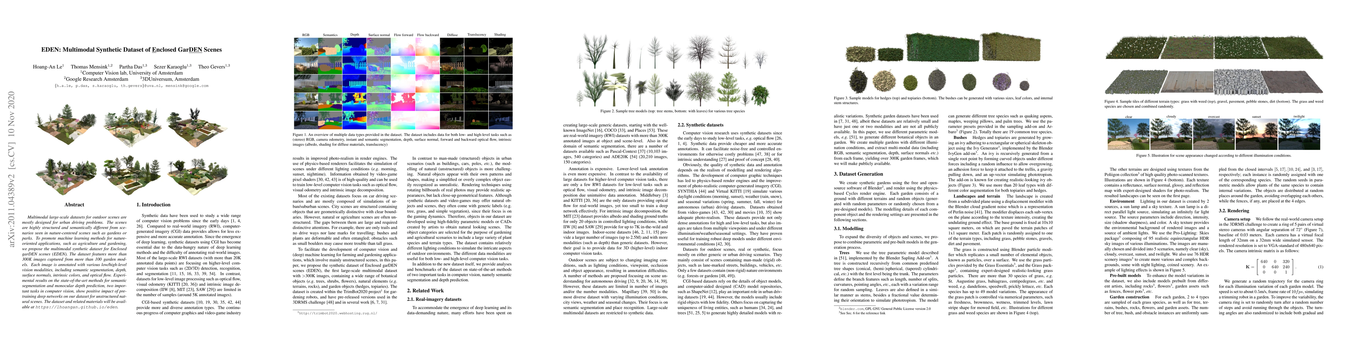 The research introduces EDEN, a multimodal synthetic dataset of enclosed garden scenes, addressing the lack of datasets for nature-oriented applications. Experiments show that pre-training deep networks on EDEN improves performance in semantic segmentation and monocular depth prediction for unstructured natural scenes.