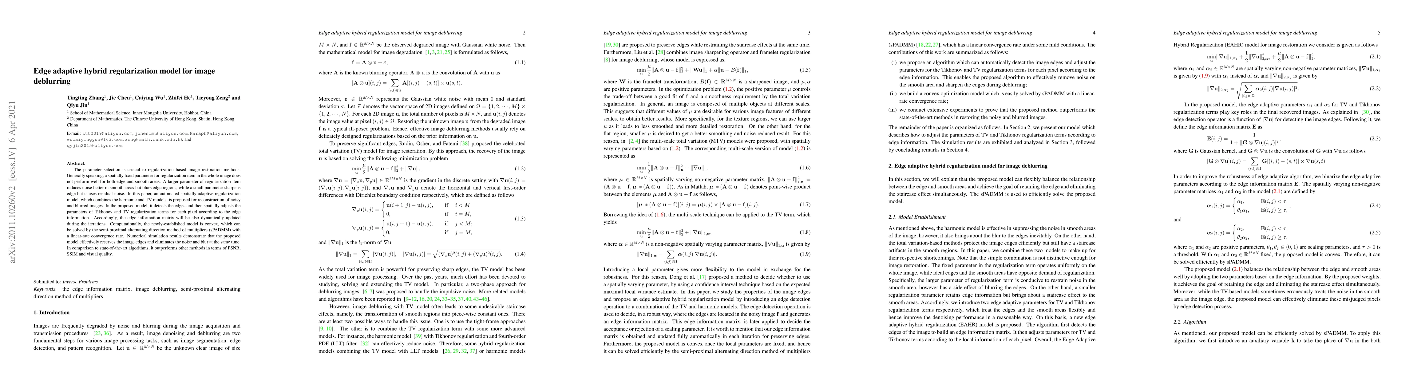 A new image deblurring model adapts regularization parameters based on edge detection to preserve edges while reducing noise and blur.