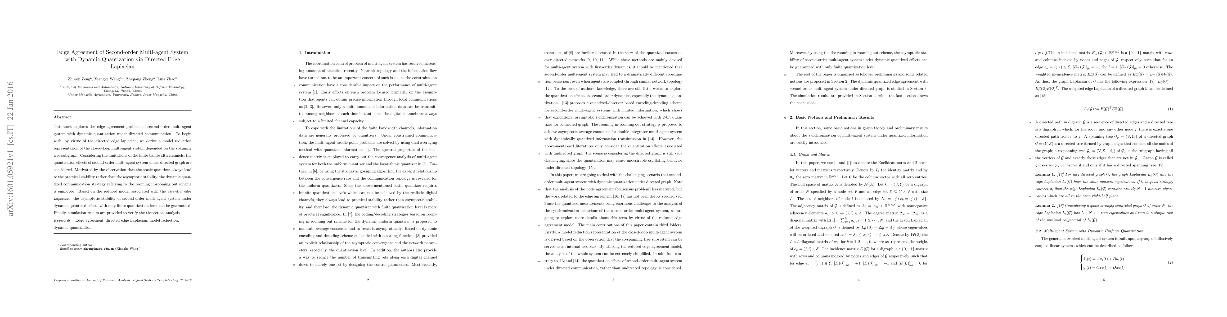 This research paper explores the stability of a second-order multi-agent system with dynamic quantization under directed communication. It shows that even with limited quantization levels, asymptotic stability can be achieved using a specific communication strategy.
