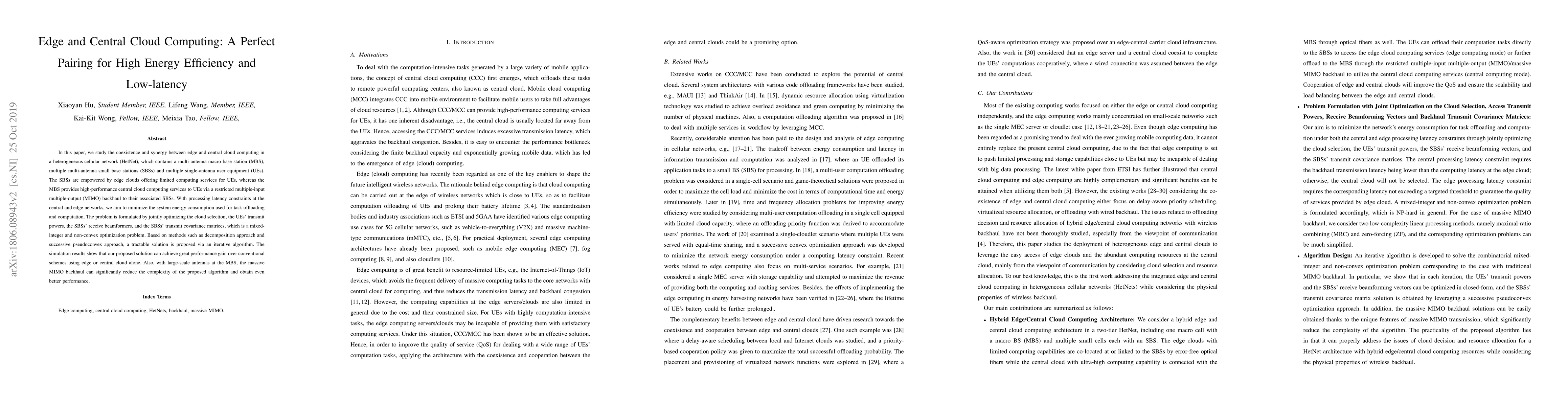 In this paper, we study the coexistence and synergy between edge and central cloud computing in a heterogeneous cellular network (HetNet), which contains a multi-antenna macro base station (MBS), multiple multi-antenna small base stations (SBSs) and multiple single-antenna user equipment (UEs). The SBSs are empowered by edge clouds offering limited computing services for UEs, whereas the MBS provides high-performance central cloud computing services to UEs via a restricted multiple-input multiple-output (MIMO) backhaul to their associated SBSs. With processing latency constraints at the central and edge networks, we aim to minimize the system energy consumption used for task offloading and computation. The problem is formulated by jointly optimizing the cloud selection, the UEs' transmit powers, the SBSs' receive beamformers, and the SBSs' transmit covariance matrices, which is {a mixed-integer and non-convex optimization problem}. Based on methods such as decomposition approach and successive pseudoconvex approach, a tractable solution is proposed via an iterative algorithm. The simulation results show that our proposed solution can achieve great performance gain over conventional schemes using edge or central cloud alone. Also, with large-scale antennas at the MBS, the massive MIMO backhaul can significantly reduce the complexity of the proposed algorithm and obtain even better performance.