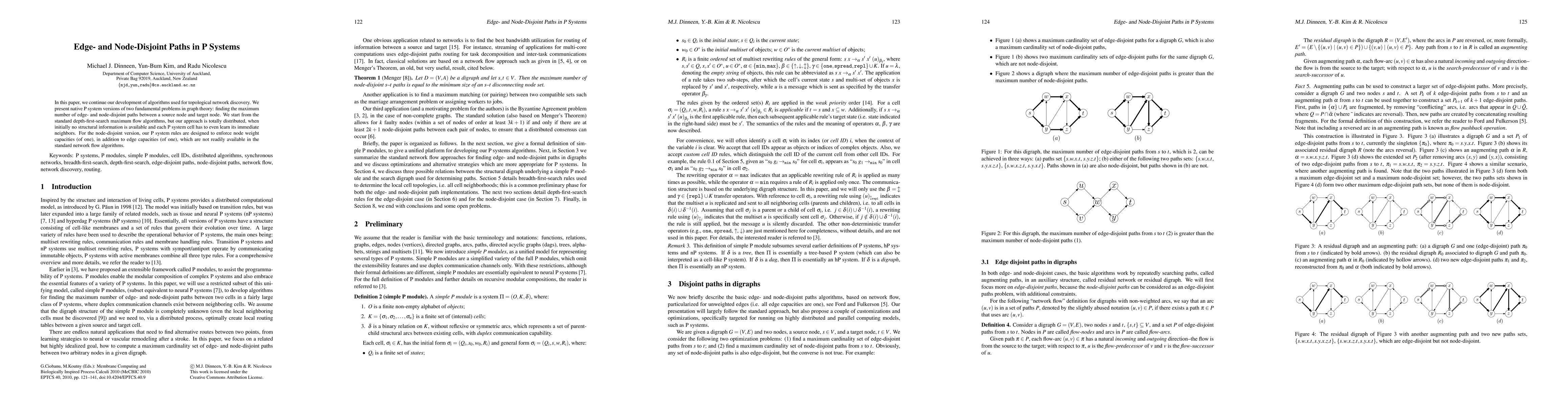 In this paper, we continue our development of algorithms used for topological network discovery. We present native P system versions of two fundamental problems in graph theory: finding the maximum number of edge- and node-disjoint paths between a source node and target node. We start from the standard depth-first-search maximum flow algorithms, but our approach is totally distributed, when initially no structural information is available and each P system cell has to even learn its immediate neighbors. For the node-disjoint version, our P system rules are designed to enforce node weight capacities (of one), in addition to edge capacities (of one), which are not readily available in the standard network flow algorithms.