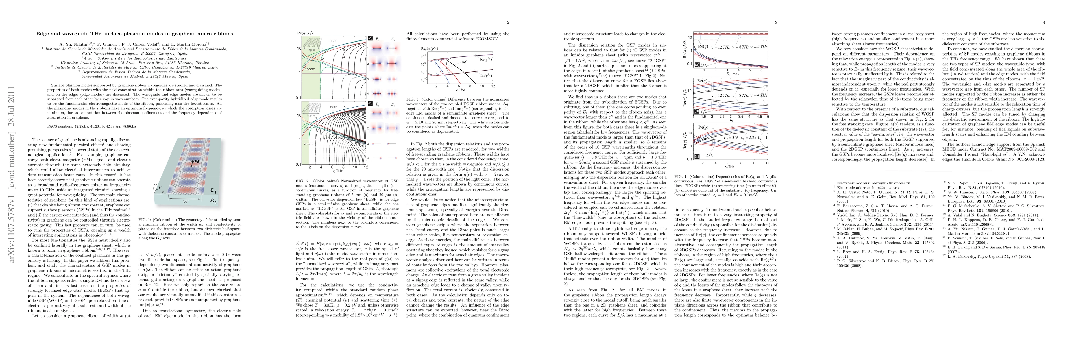 This paper classifies surface plasmon modes in graphene micro-ribbons, distinguishing between waveguide modes within the ribbon and edge modes concentrated on the edges. The fundamental edge mode exhibits the lowest losses and operates at an optimum frequency where absorption losses are minimized due to the interplay between plasmon confinement and frequency-dependent absorption in graphene.