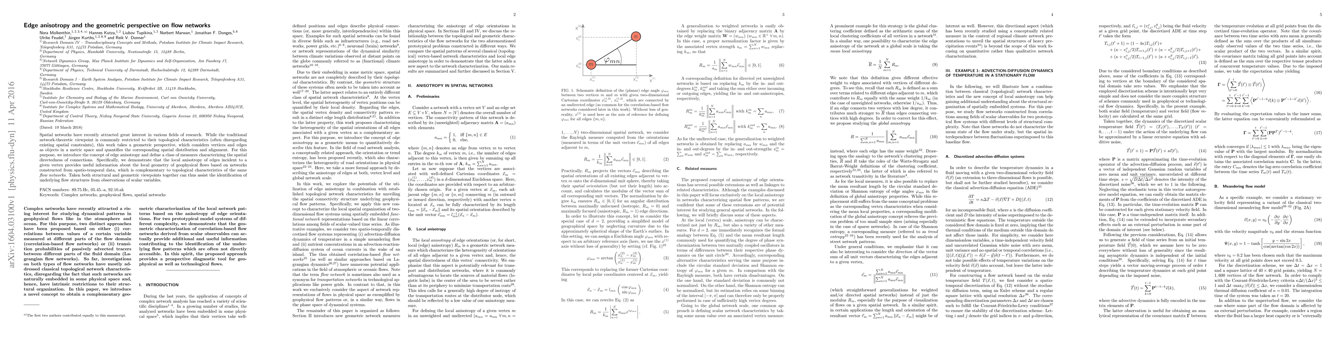 Spatial networks have recently attracted great interest in various fields of research. While the traditional network-theoretic viewpoint is commonly restricted to their topological characteristics (often disregarding existing spatial constraints), this work takes a geometric perspective, which considers vertices and edges as objects in a metric space and quantifies the corresponding spatial distribution and alignment. For this purpose, we introduce the concept of edge anisotropy and define a class of measures characterizing the spatial directedness of connections. Specifically, we demonstrate that the local anisotropy of edges incident to a given vertex provides useful information about the local geometry of geophysical flows based on networks constructed from spatio-temporal data, which is complementary to topological characteristics of the same flow networks. Taken both structural and geometric viewpoints together can thus assist the identification of underlying flow structures from observations of scalar variables.